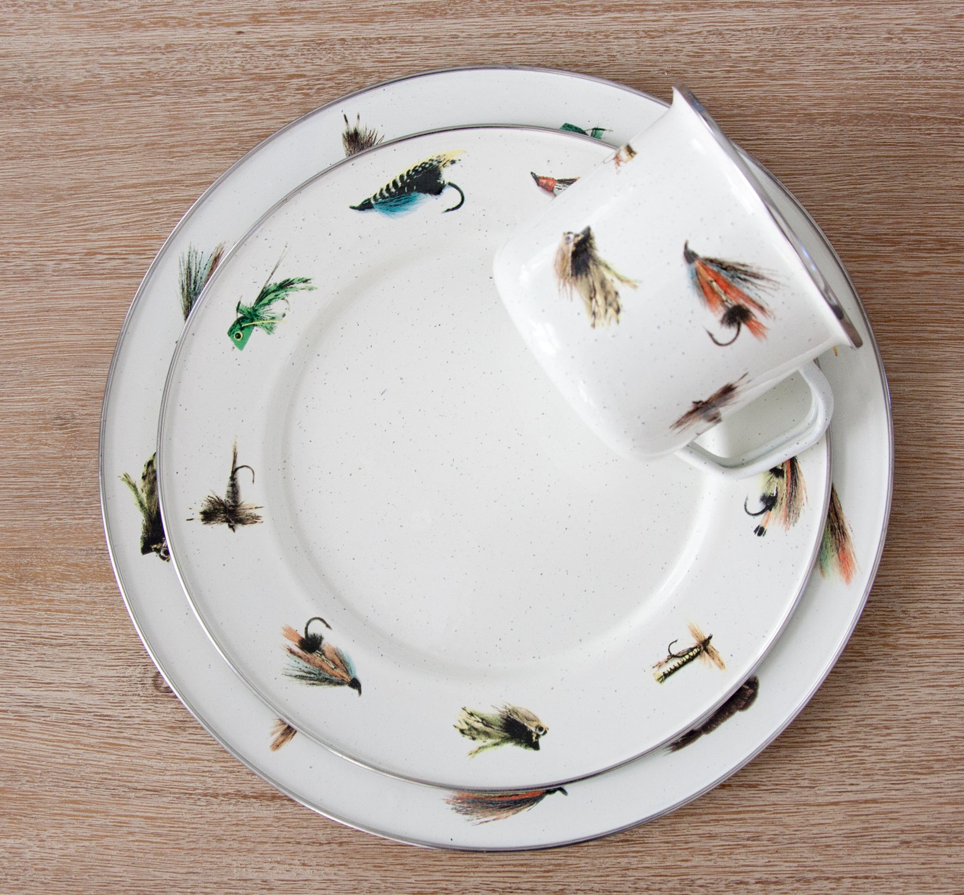 Start your day with the rustic charm of the Fishing Fly 24 oz Grande Mugs. This set of four enamelware mugs showcases a whimsical fishing fly design, making them perfect for outdoor enthusiasts and seafood lovers alike. With their generous capacity, these mugs are great for your morning coffee or any beverage that needs a bit of extra room.