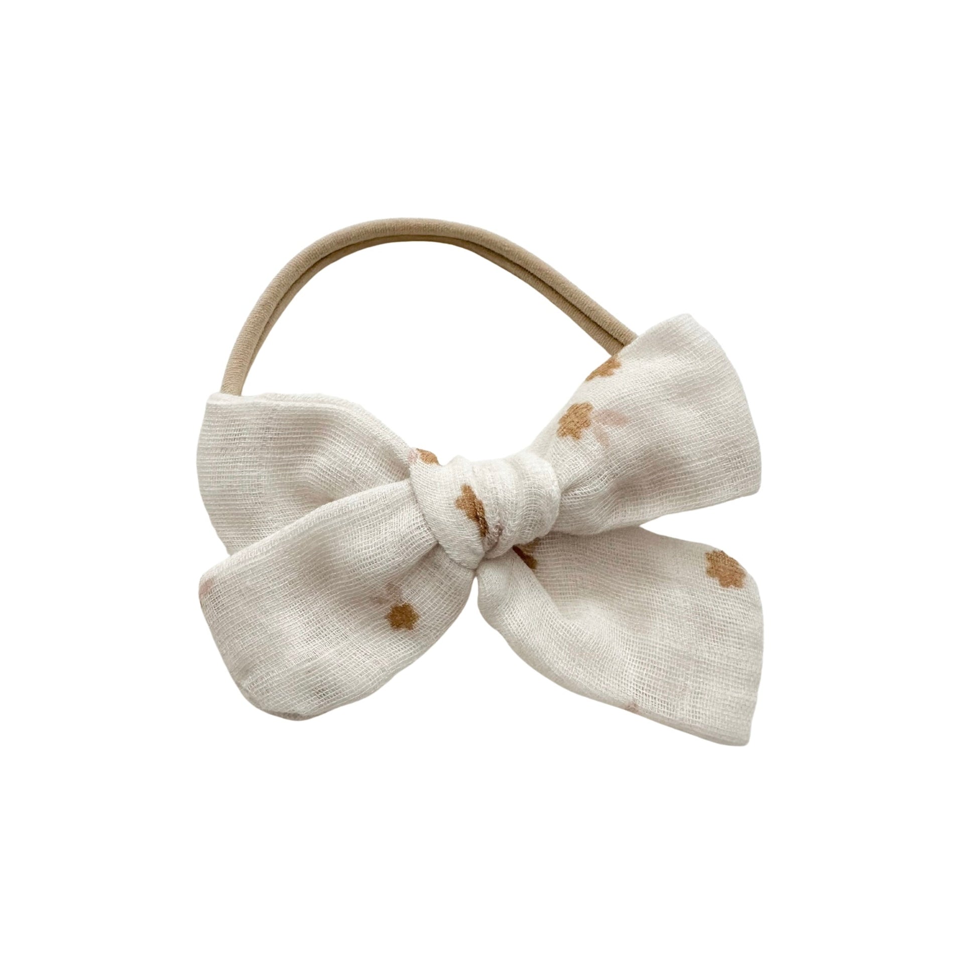 This sweet baby bow headband is made of a soft muslin fabric and measures 4” wide. Matches perfectly with our Fleur Lace quilt blanket.