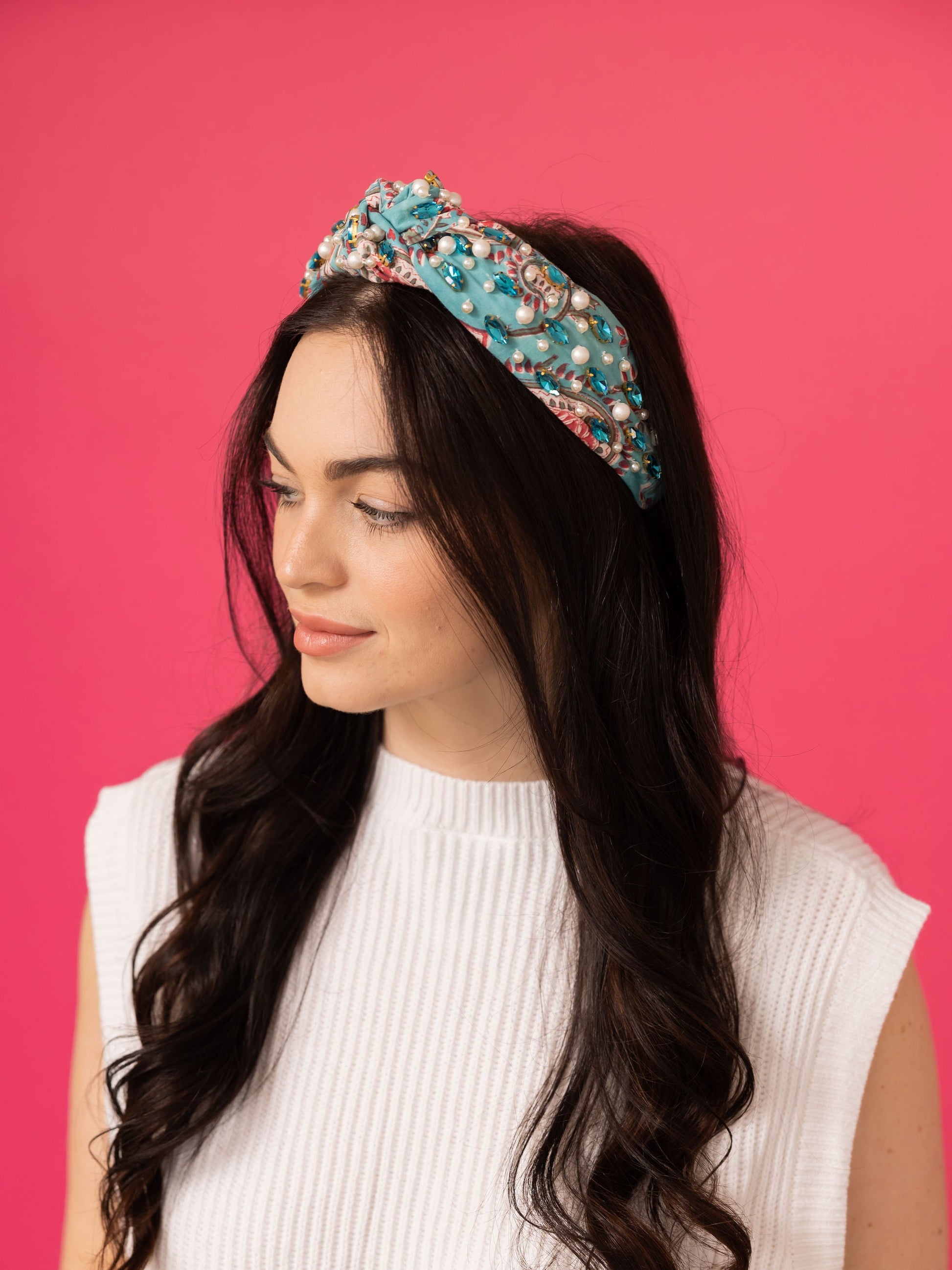 Floral Print Headband - Blue Rhinestone Pink Paisley