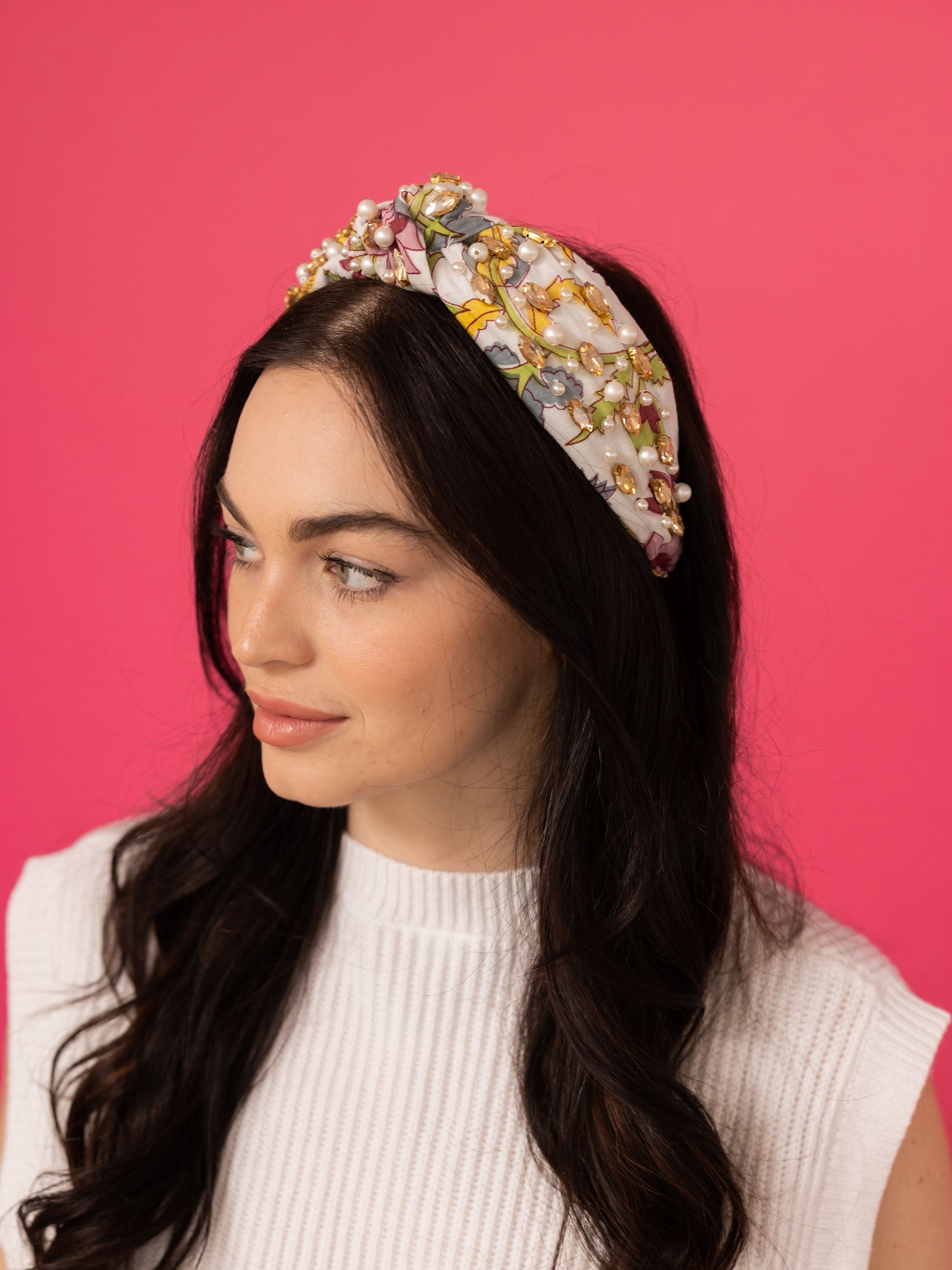 This beautiful floral print headband that is accented with rhinestone and pearl detail is perfect to wear all Spring and Summer.