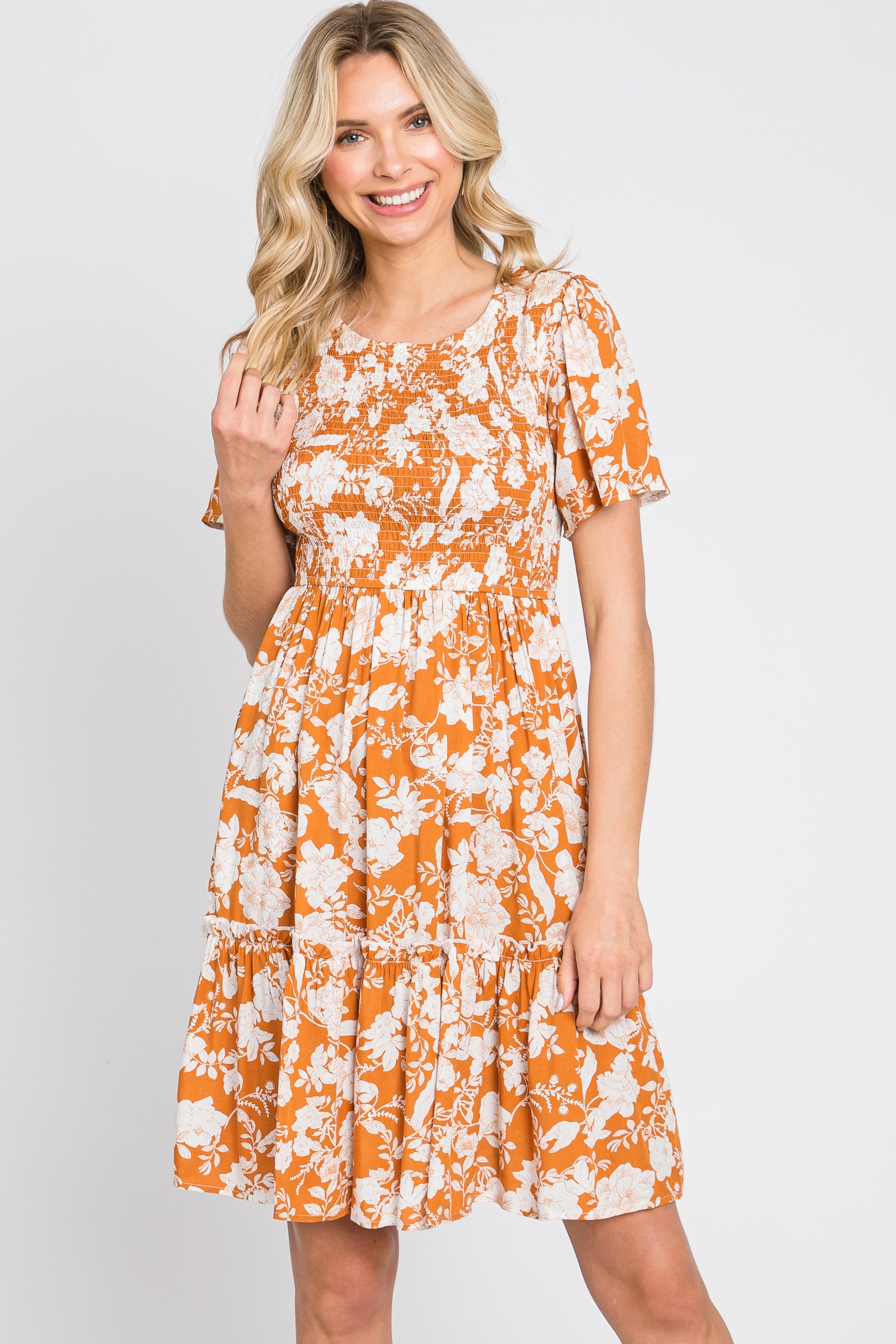 A floral print maternity dress featuring a smocked bodice, short sleeves, side pockets, and a gathered bottom tier.