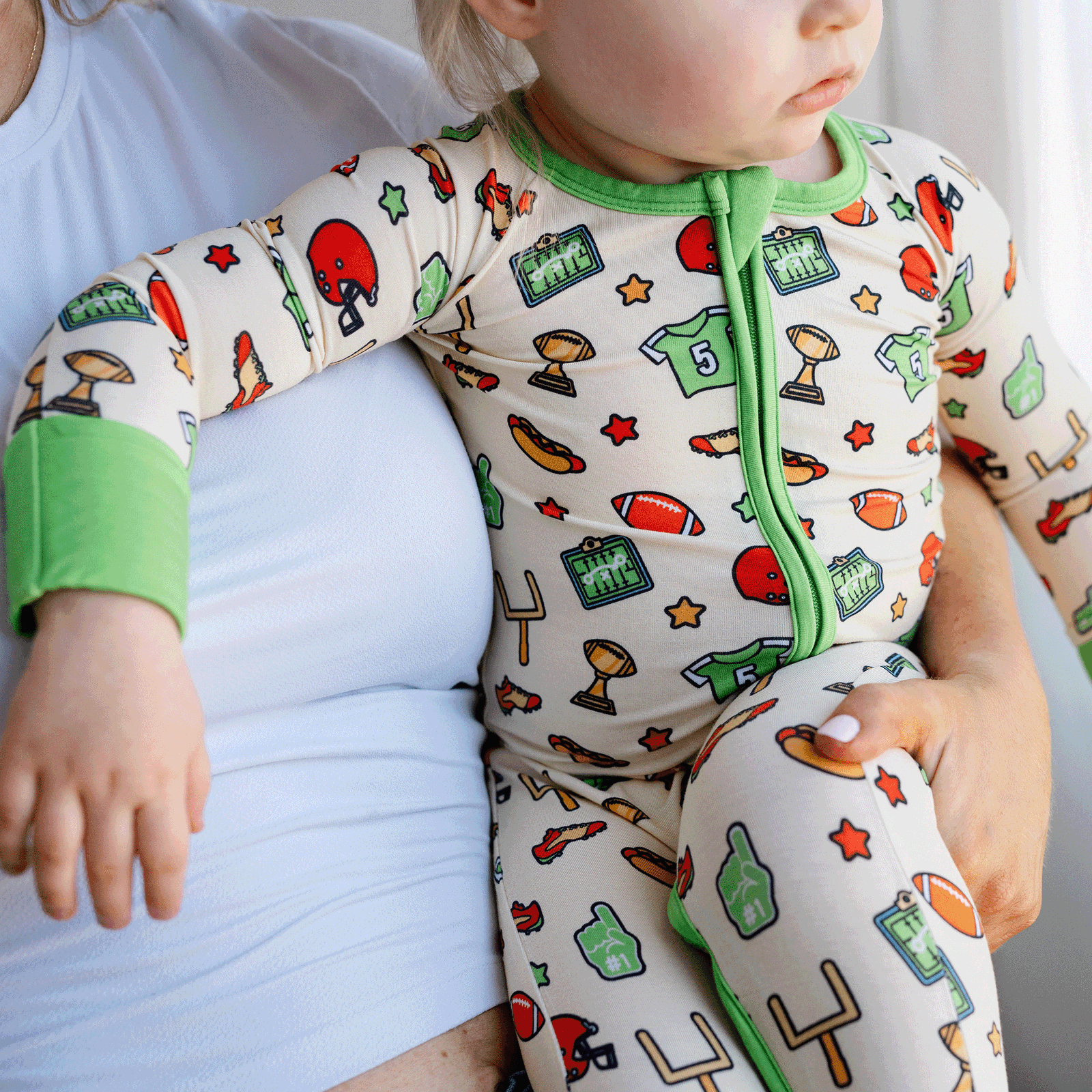 Get your little MVP ready for kickoff with our ultra-soft Football One-Piece. Made from premium bamboo fabric, this cozy sleeper is designed for comfort, breathability, and maximum mobility—perfect for cuddles, crawls, or cheering from the sidelines. Featuring a fun all-over football print with helmets, balls, and field icons, it's a touchdown for any future fan.