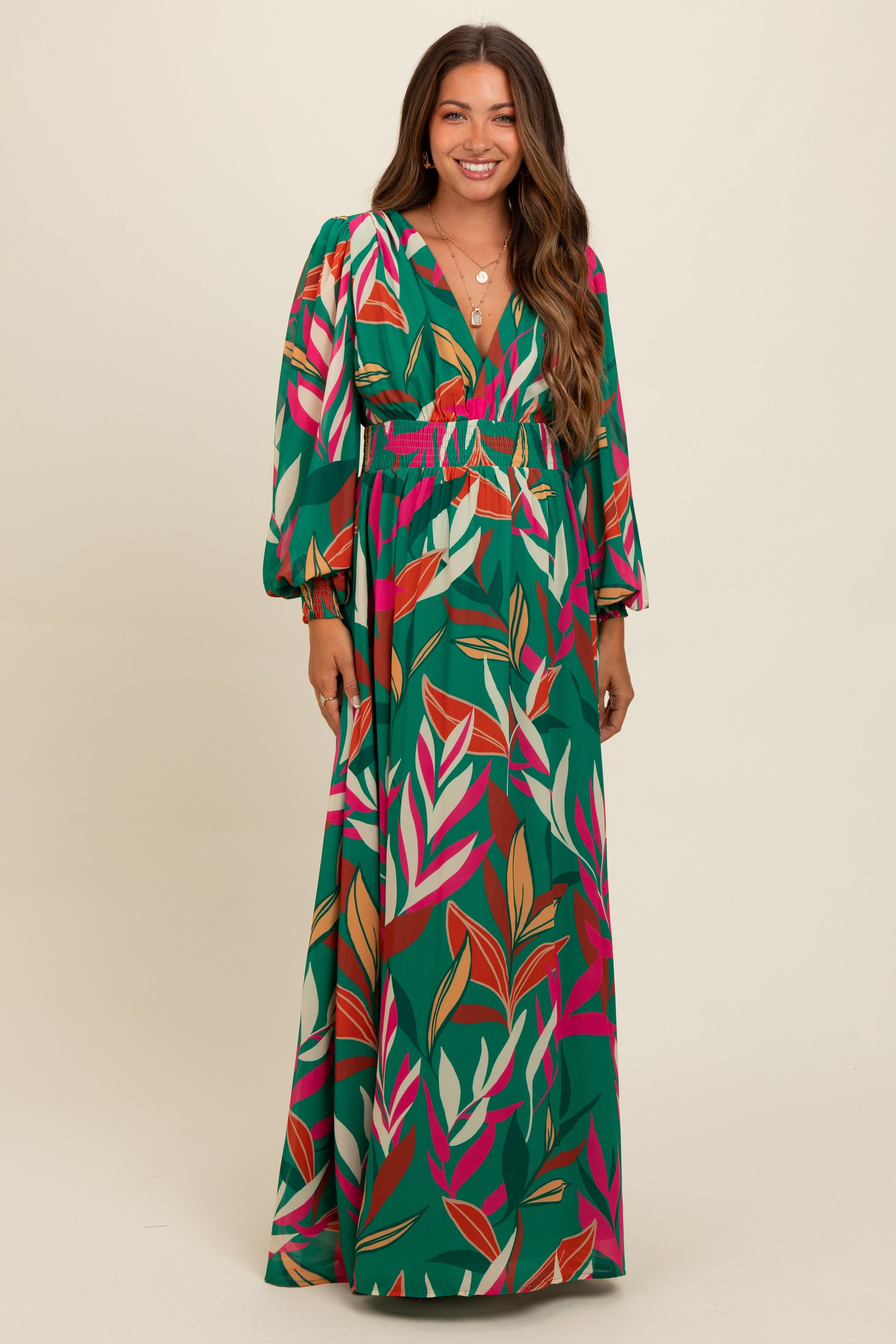 Forest Green Leaf Print Deep V-Neck Maternity Maxi Dress