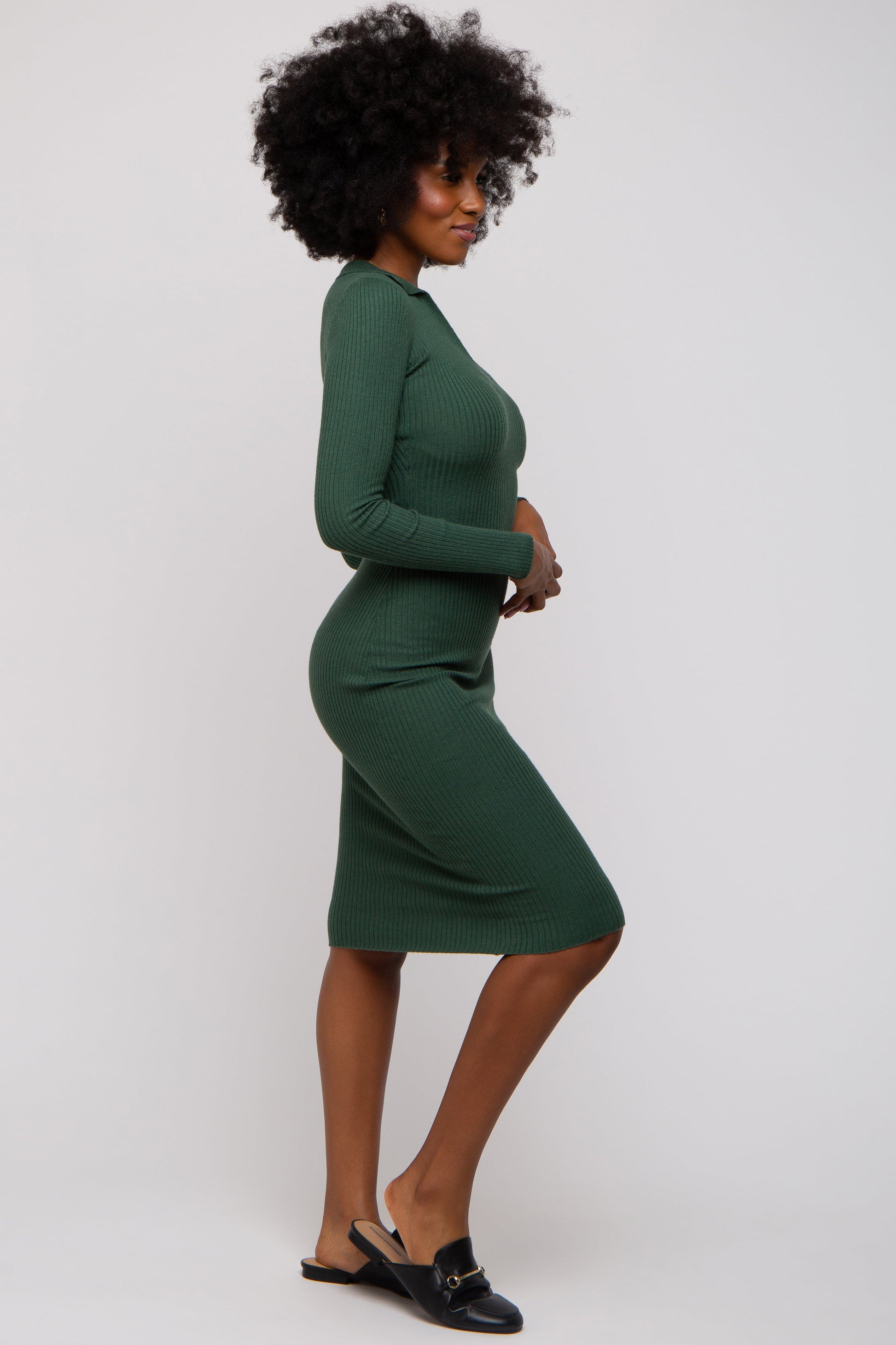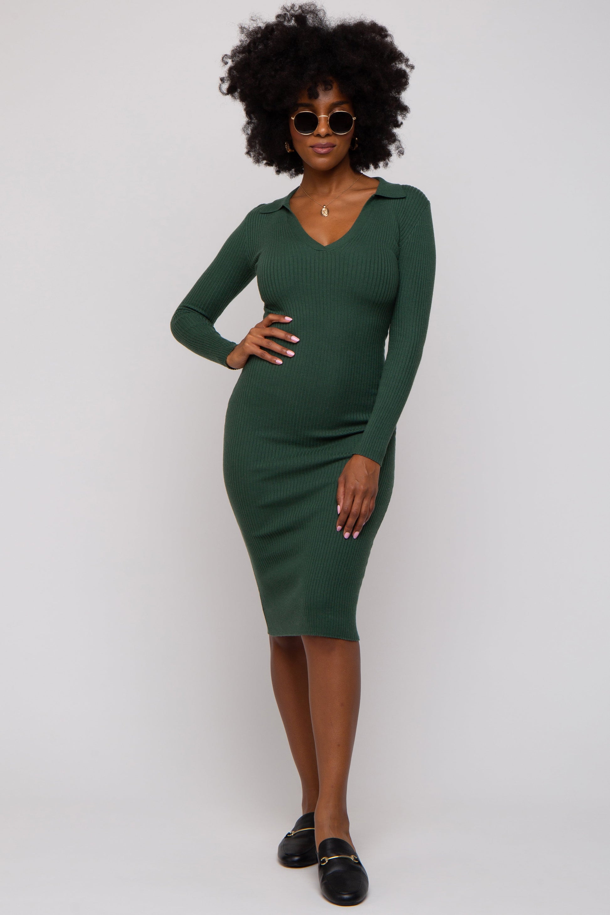 A solid ribbed knit fitted dress with a collared v-neckline.