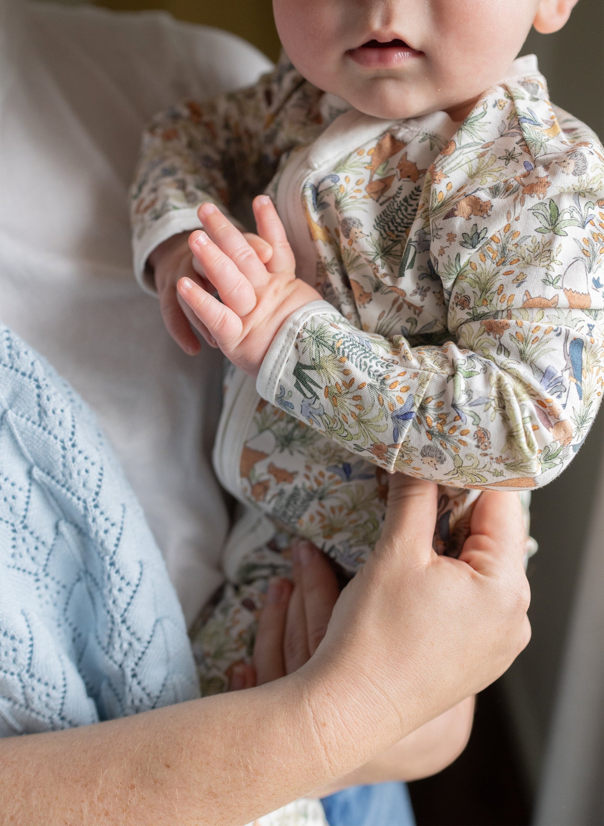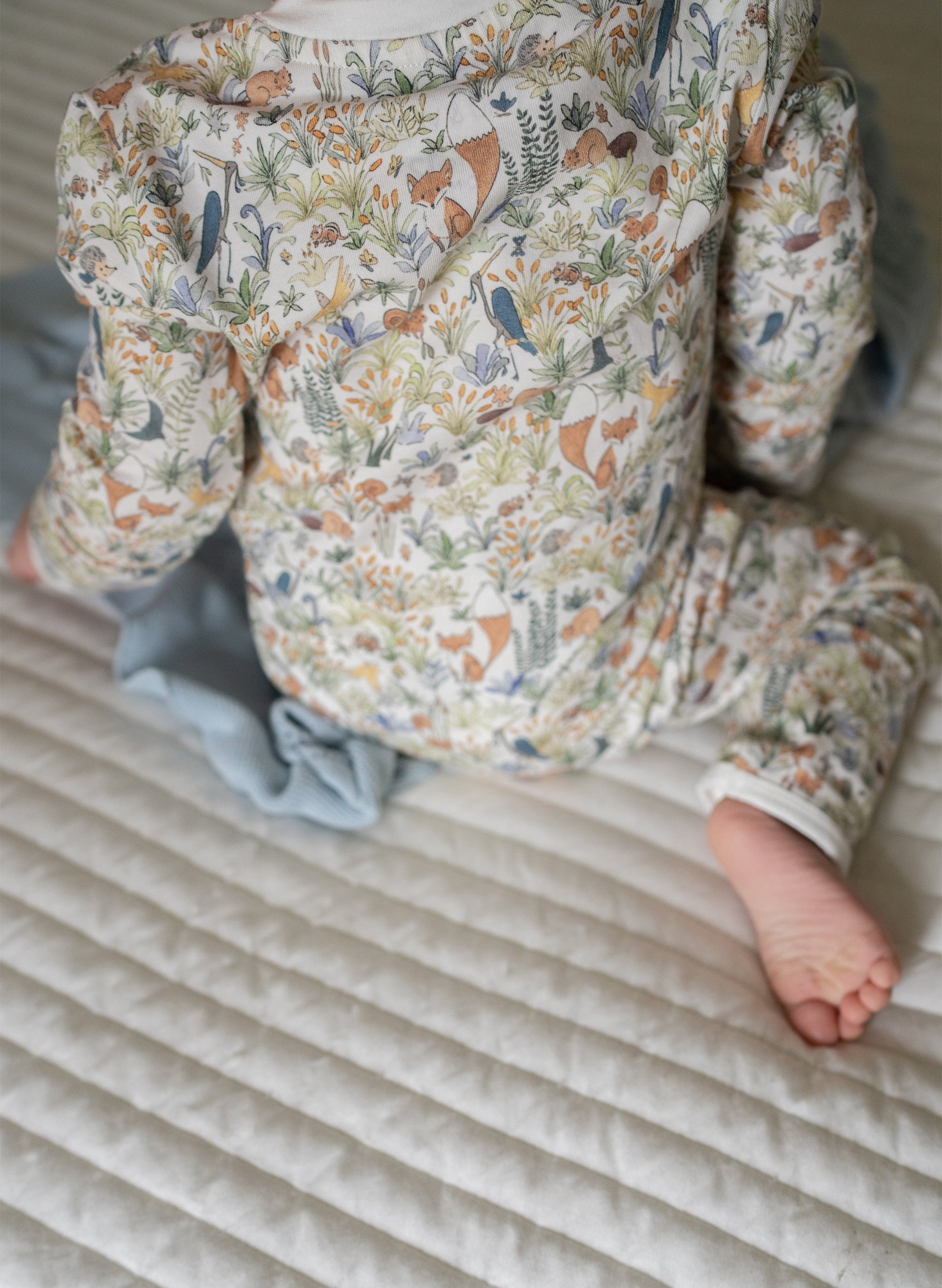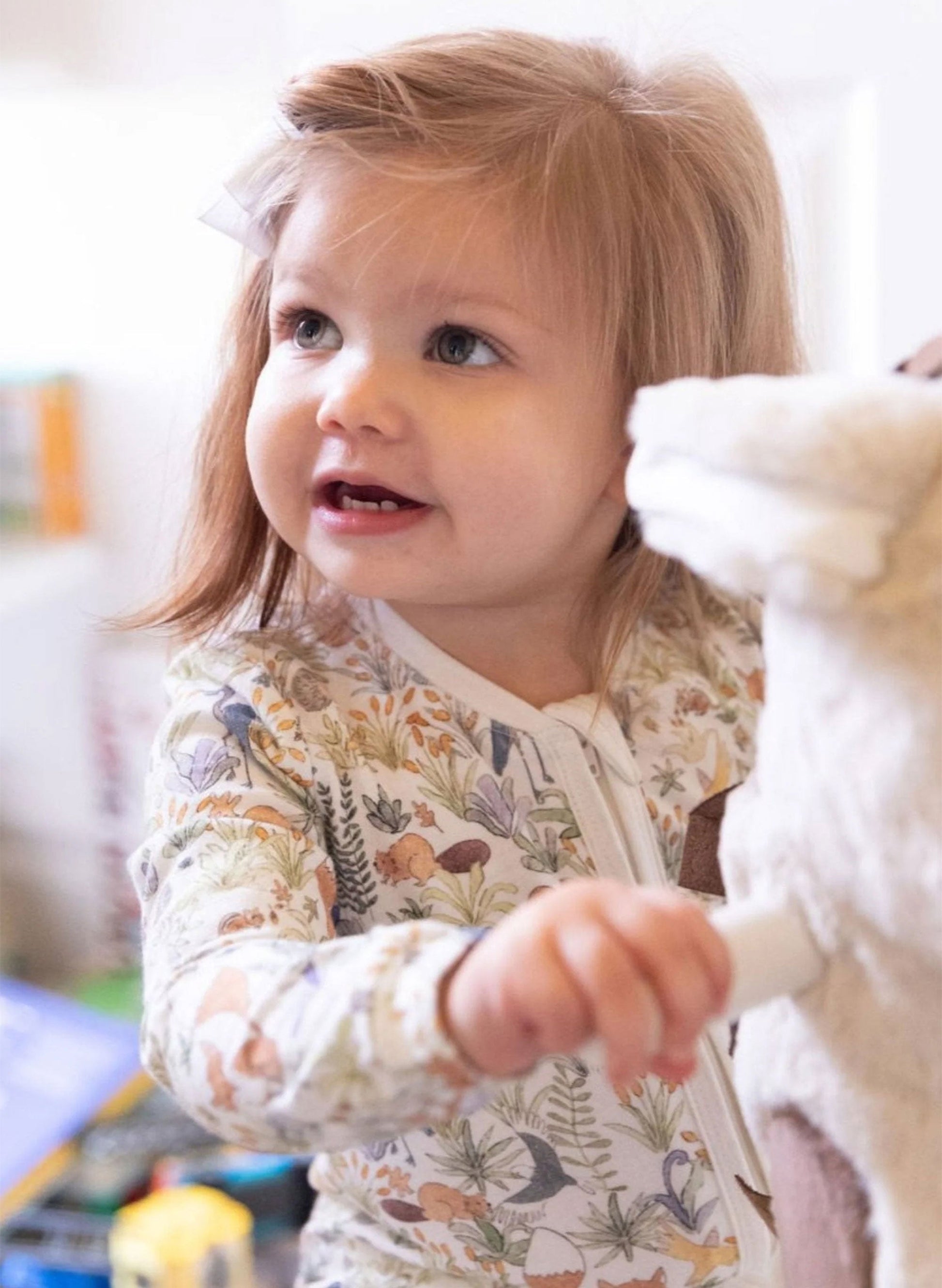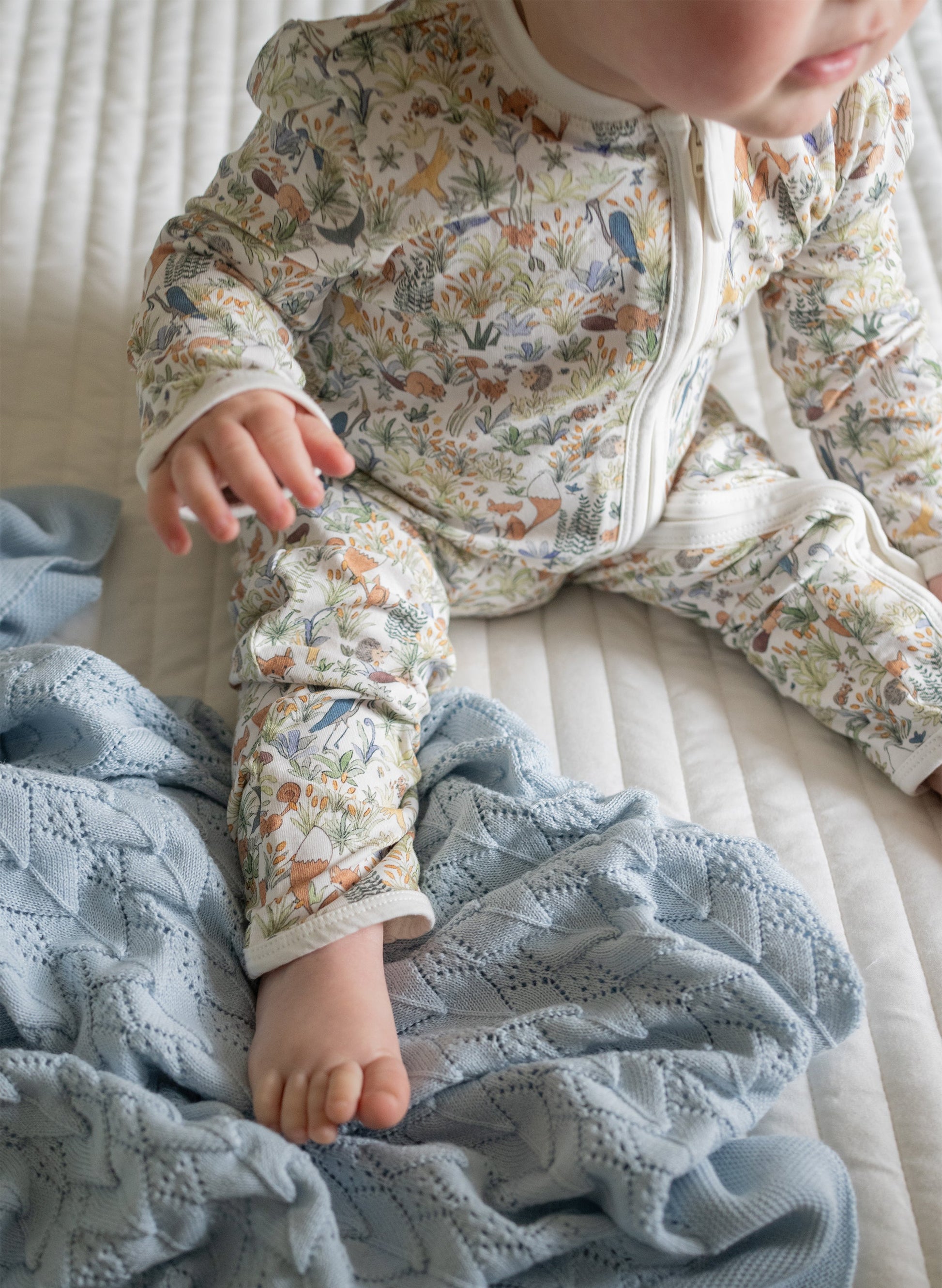 A soft essential, thoughtfully designed. This one-piece in our signature Foxy Forest print is as practical as it is charming. Made for comfort and ease, it features fold-over hand mittens (up to size 9–12 months) to help prevent scratches, convertible foot cuffs for room to grow, and a double zipper for quick, no-fuss diaper changes. Everyday ease, with a little extra joy.