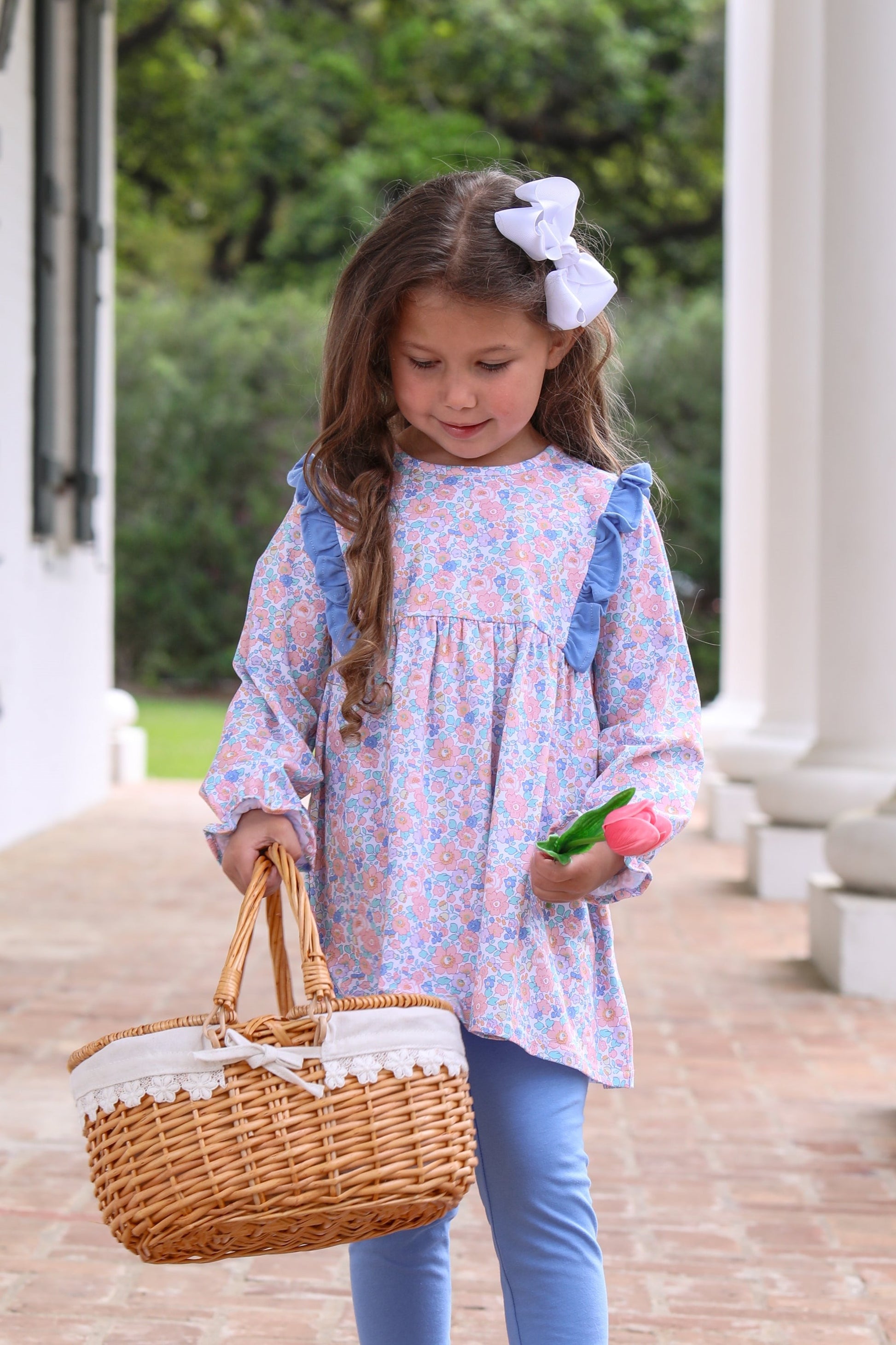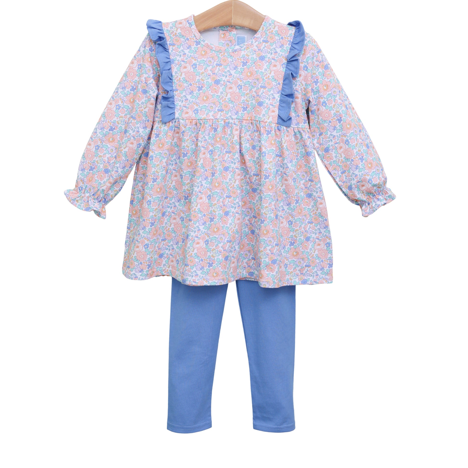 The long-sleeve tunic top is accented with periwinkle ruffle trim and paired with coordinating knit pants for an easy, polished look that’s perfect for playdates, church, or picture days.