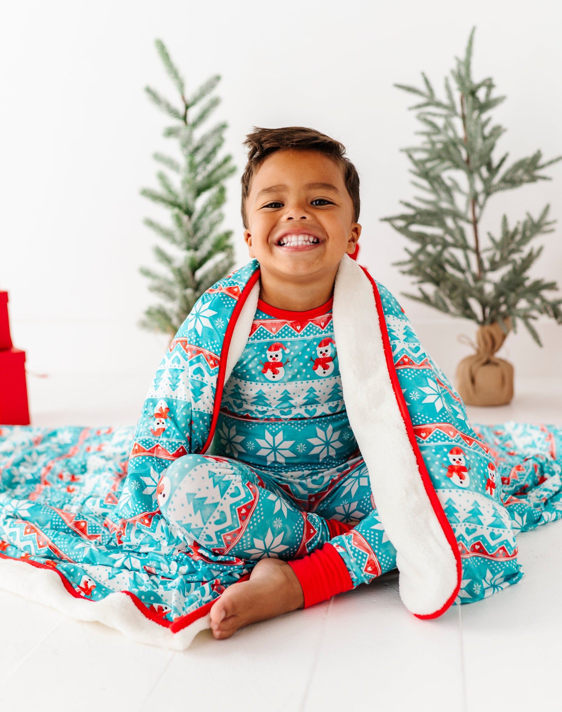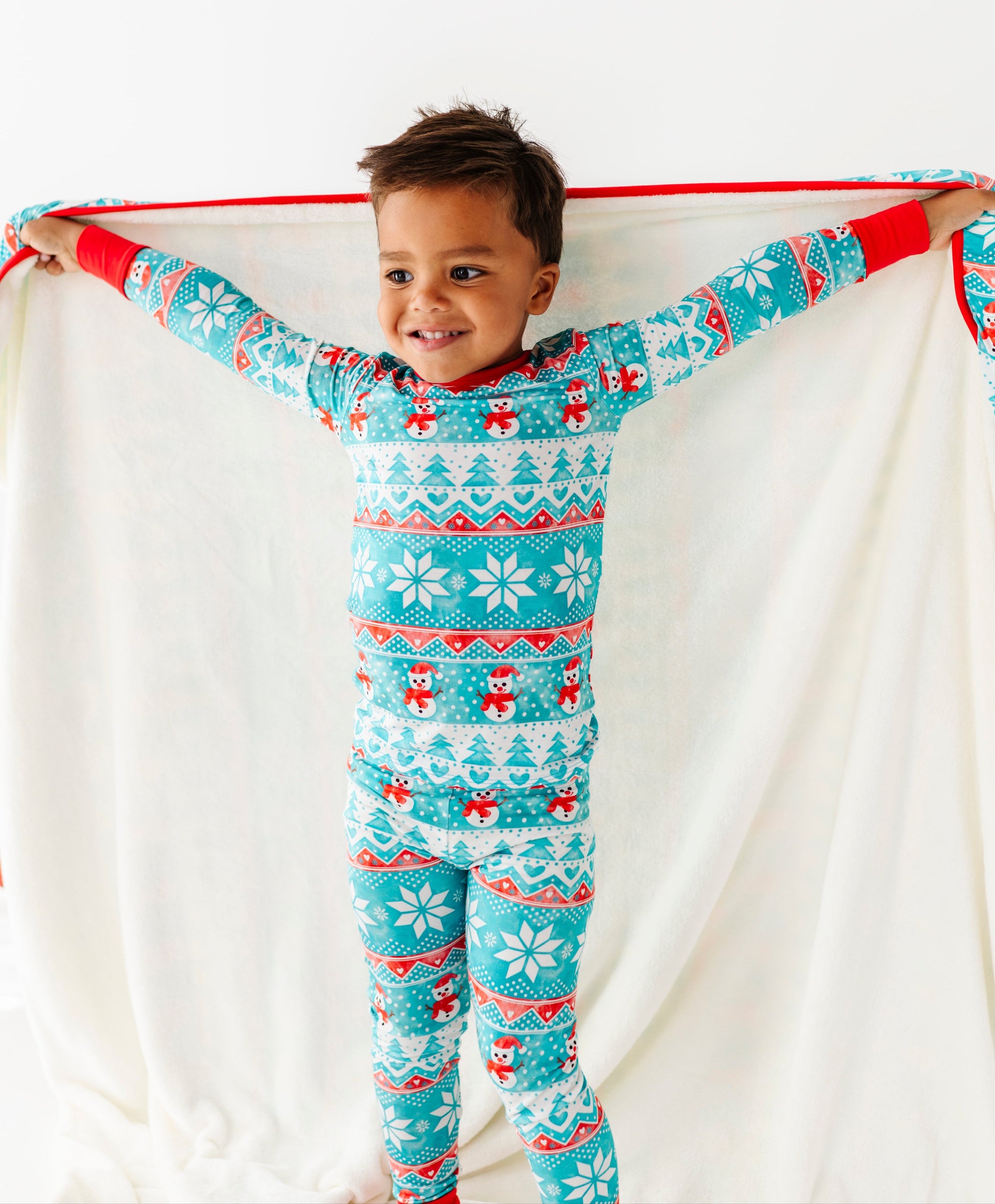 Celebrate cozy season. Perfect for tree-trimming, movie marathons, and long winter evenings. The front is our buttery-soft bamboo viscose blend (breathable and gentle on skin), and the reverse is a cloud-like plush for snuggly warmth. Finished in a merry fair-isle of snowmen, stars, and evergreens, it brings instant cheer whether you live by the beach or in a winter wonderland.