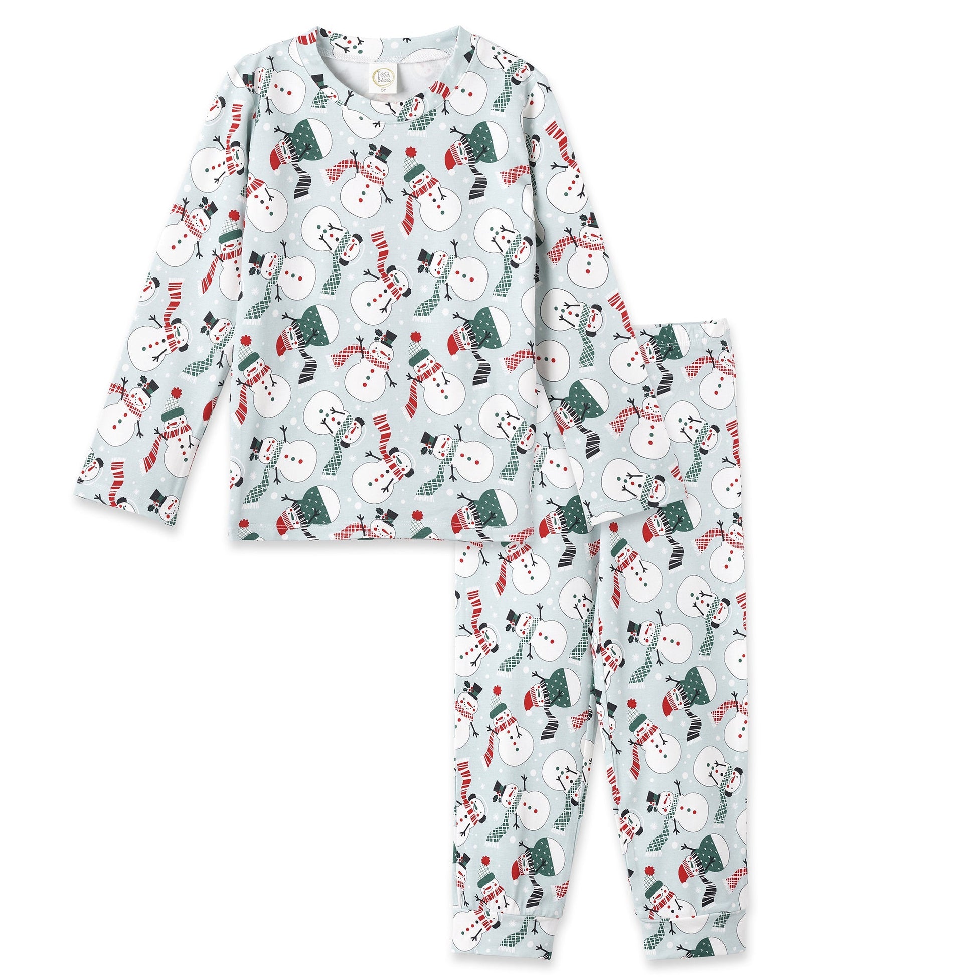 Frosty Fun Awaits! Wrap your child in cozy winter magic with our ultra-soft kids' pajama set, crafted from a bamboo/cotton/spandex blend. Featuring festive snowmen, this set is perfect for dreamy winter wonderland adventures and a good night's sleep! With absorbent, hypoallergenic, eco-friendly, and sweat-resistant fabric, your little one will stay comfy all night. The top has a comfy crew neck, and the bottoms have an elastic waist. Machine wash warm, tumble dry low. ❄️