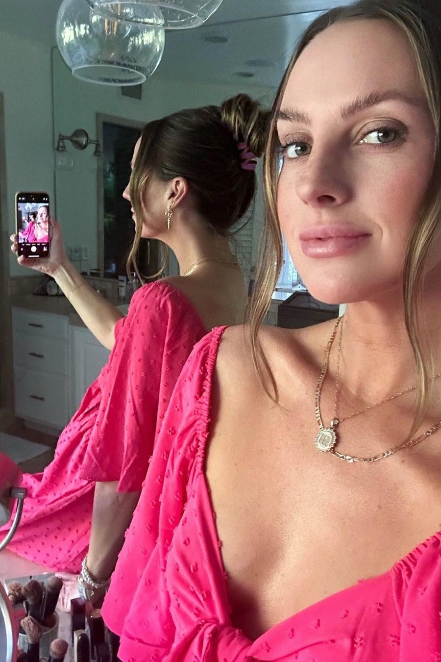 Fuchsia Textured Dot Front Tie Ruffle Sleeve Midi Dress