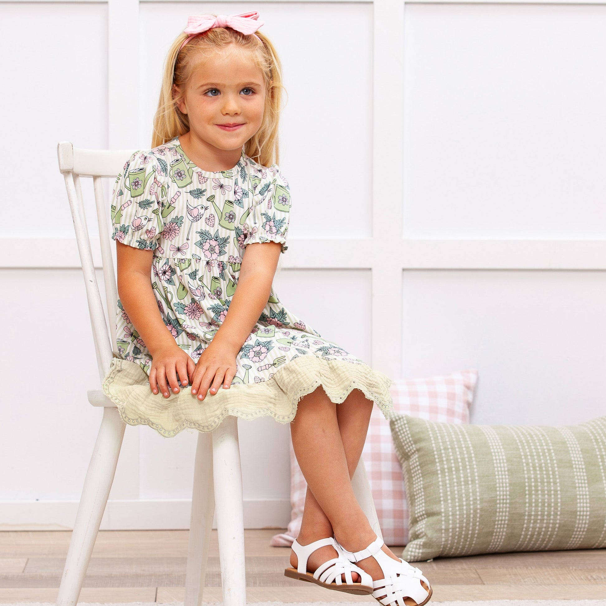 Your little blossom will be garden-party ready in this charming dress! 🌿🌸 Featuring a sweet garden print with flowers, watering cans, and birds in soft sage green and pink, plus a delicate sage green eyelet bottom ruffle for extra flair, it’s as cute as it is comfy. Made from an ultra-soft bamboo, cotton, and spandex blend, this dress is absorbent, hypoallergenic, and eco-friendly—perfect for all her adventures. Easy to wear and easy to care for, just machine wash warm and tumble dry low. Fresh, fun, and ready to bloom!