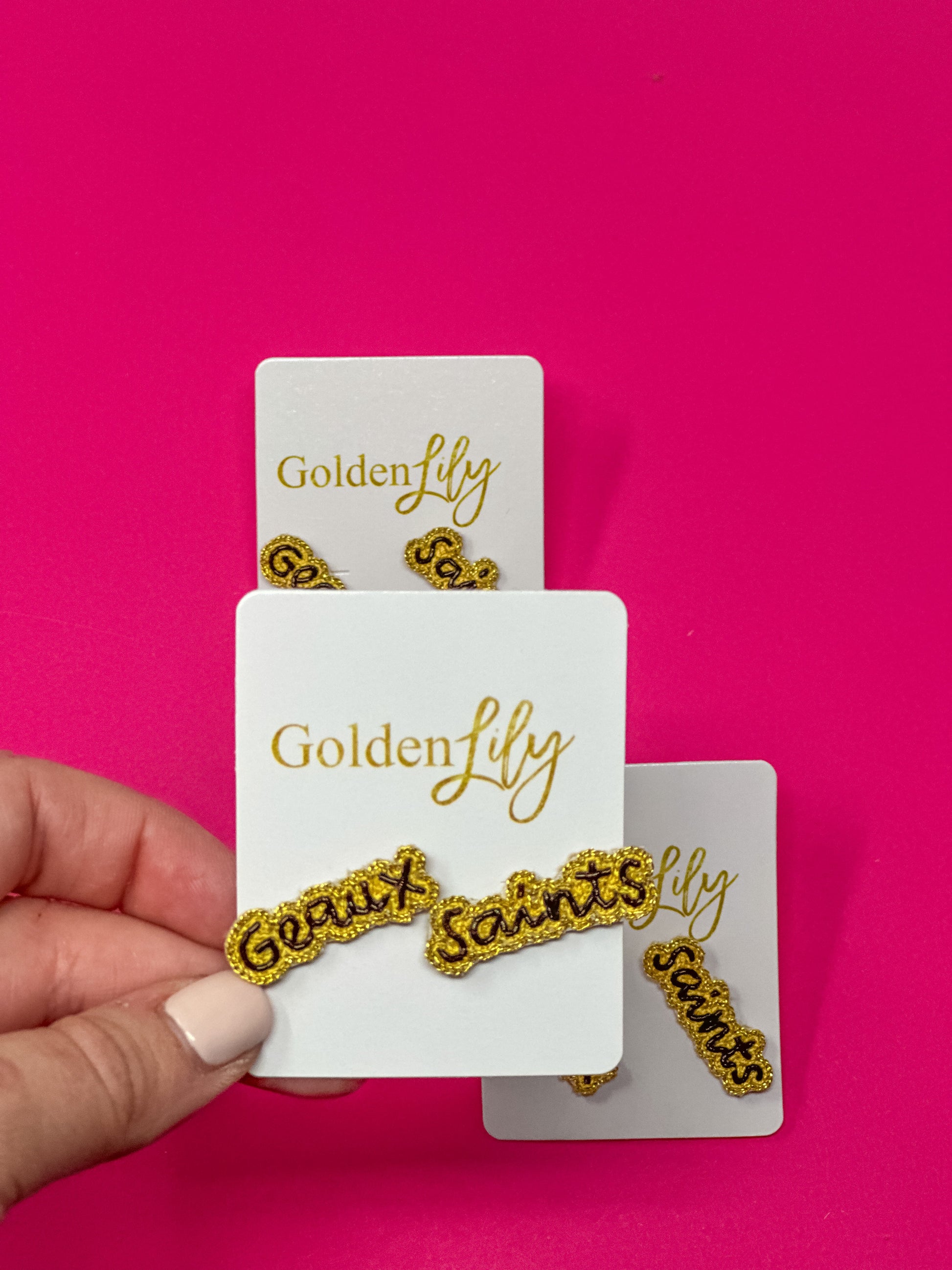 Show off your team spirit with our Saints Stud Earrings! Featuring the iconic fleur-de-lis design in bold black and gold, these earrings are the perfect accessory for game day or everyday fandom. Lightweight and easy to wear, they add just the right touch of sparkle and pride to any outfit. A must-have for every loyal Saints fan!