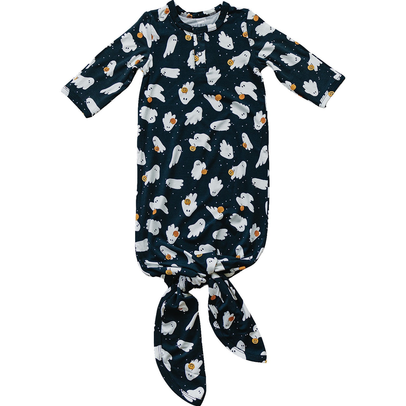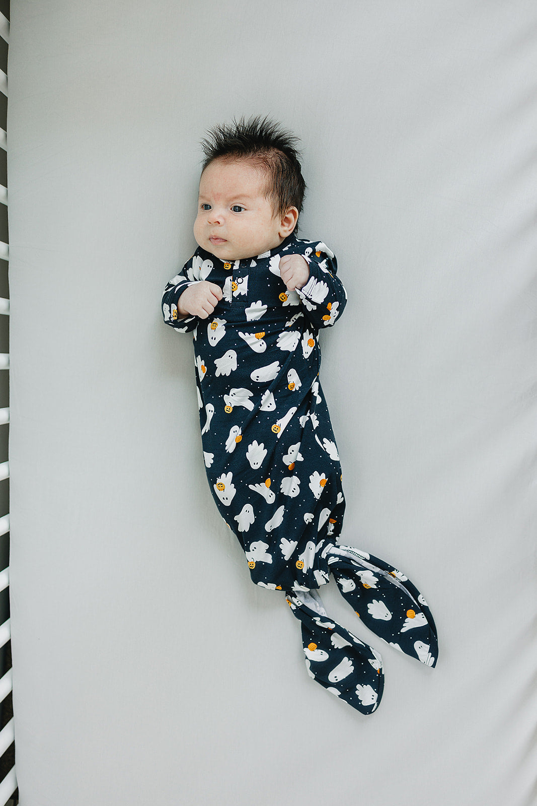 These gowns are size 0-3. We love these Halloween Themed Gowns. They are made out of supremely soft Bamboo Rayon to keep your little one comfortable. We have a variety of gender neutral designs and colors making them perfect for any baby. They have fold over hands and two snaps for easy on and off. We also have shoulder flaps to make it easily pull over your little ones head, we want to make dressing your baby as easy as possible. The bottom is easily tied and untied in a knot for no-fuss diaper changes which makes it a newborn baby essential! These are made out of the same fabric as our stretch swaddles and match the colors of the stretch swaddles, head wraps, and hats.Â