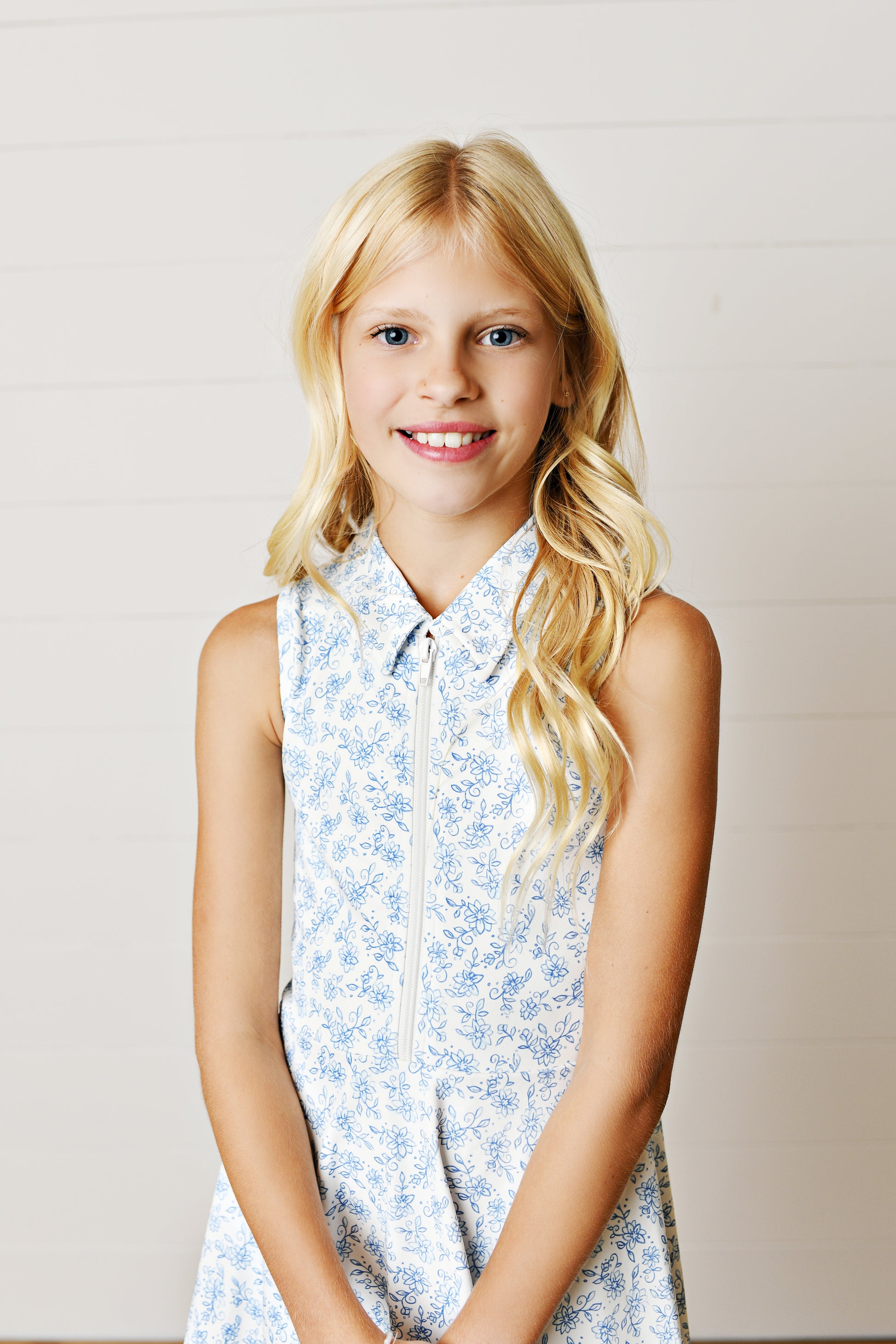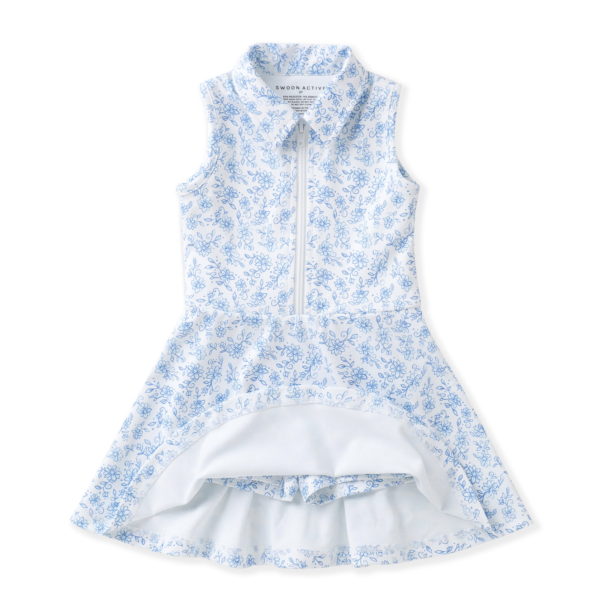 Our Girls Blue Chintz Floral Athletic Dress features a soft white background with delicate blue floral print — giving sweet southern charm with an activewear twist.