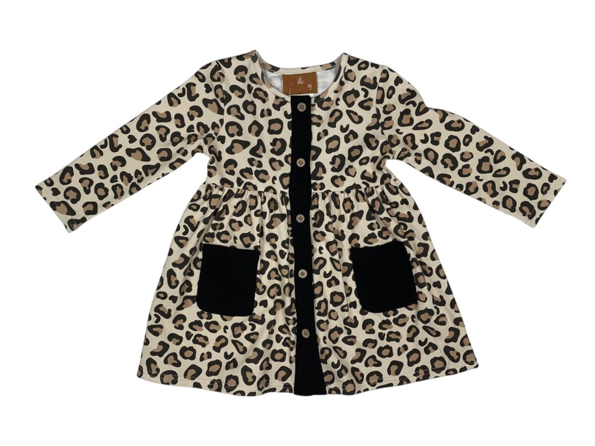 Girls Leopard Long Sleeve Dress – Button Front with Pockets