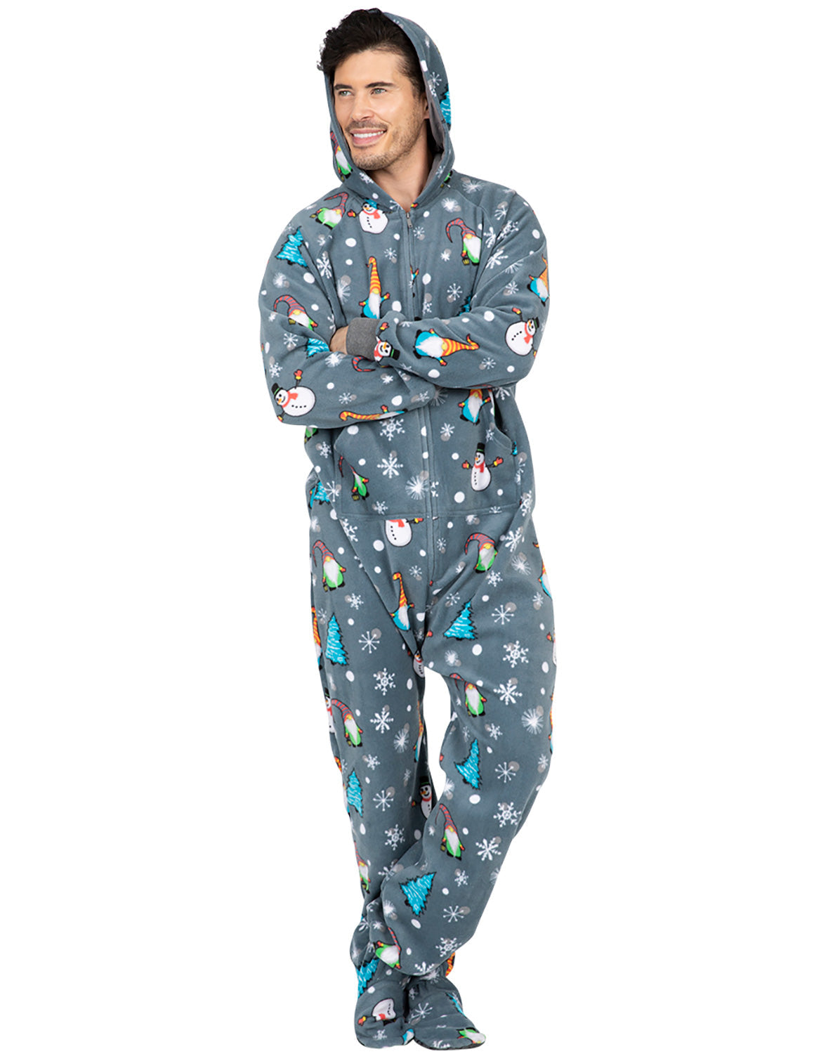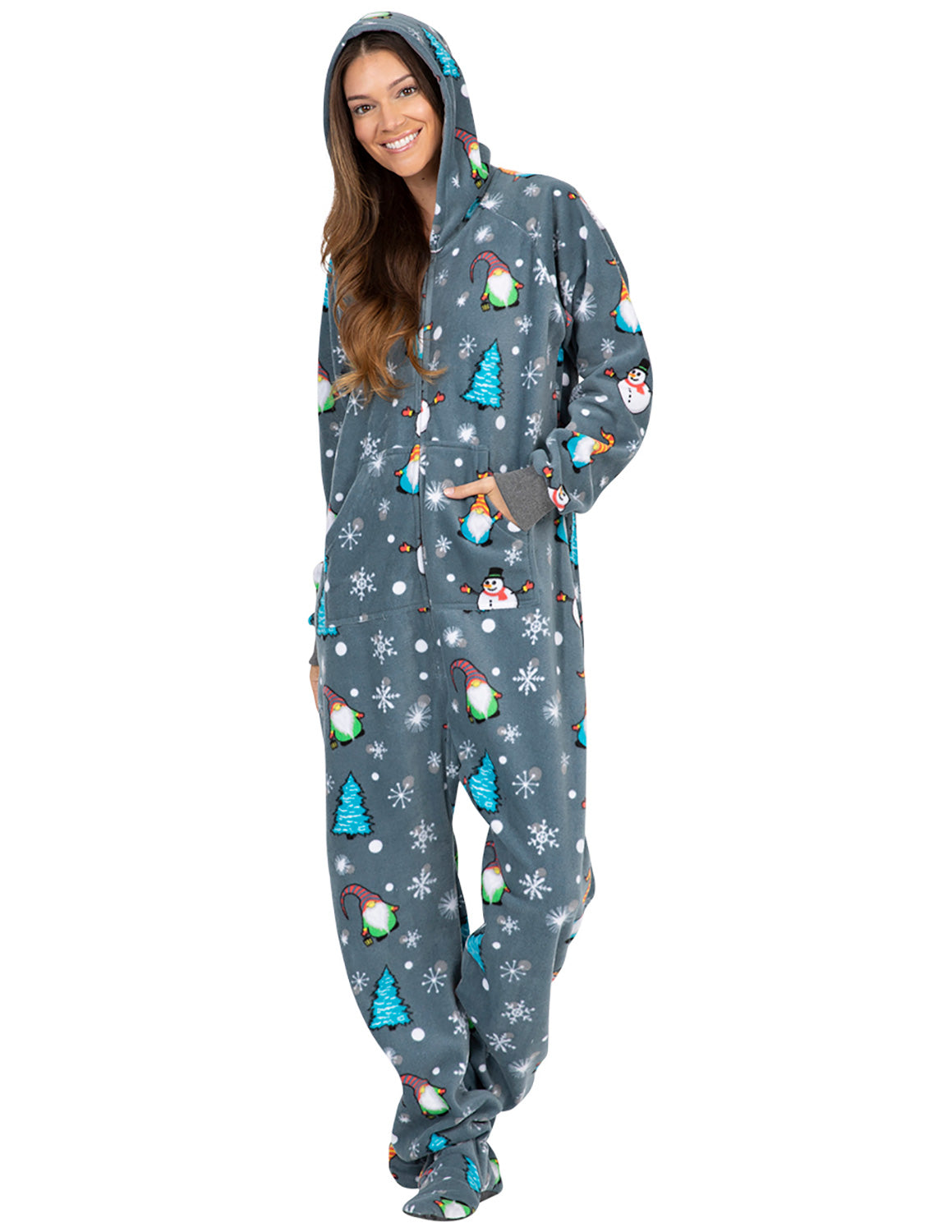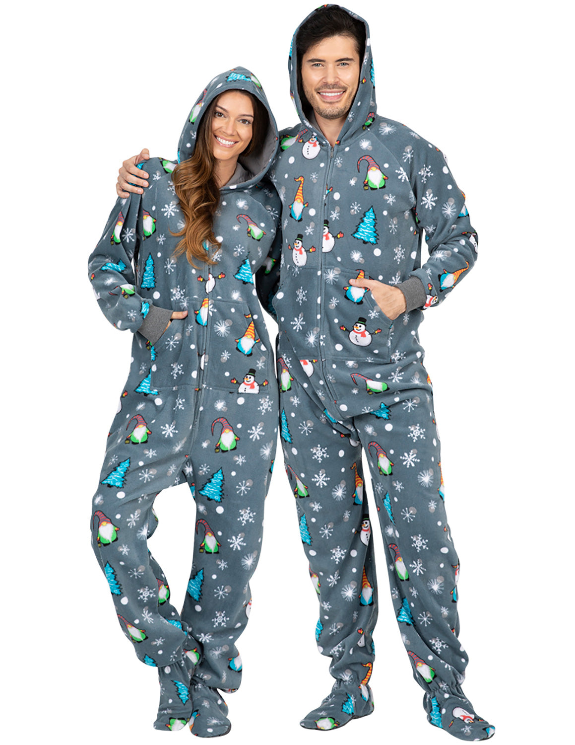 Mystical gnomes frolic with cheery snowmen in a forest on a snowy night in these magical onesies. This charming print will keep you in warm spirits, while the soft fleece fabric will warm your body from head to toe. Hoodies and pockets make these fun footed pajamas functional and trendy. Dreams are sure to be extra sweet while wearing such enchanting, and comfortable sleepwear.