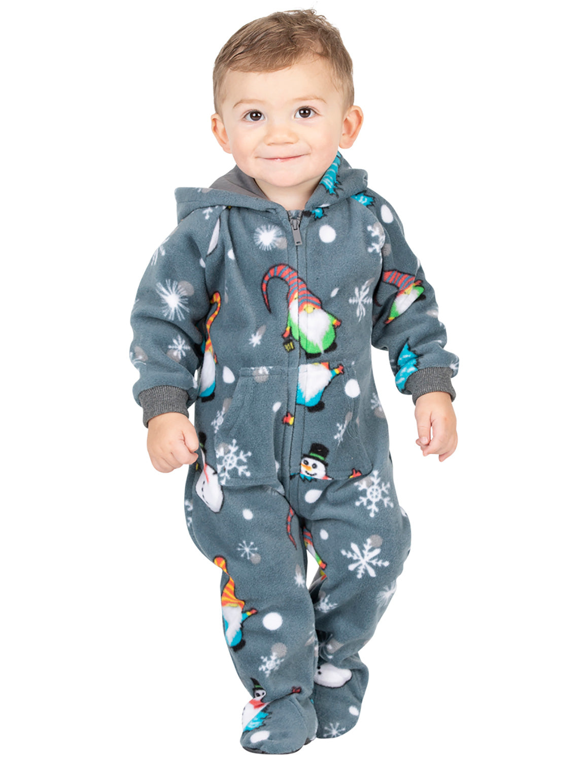 Mystical gnomes frolic with cheery snowmen in a forest on a snowy night in these magical onesies. This charming print will keep babies in warm spirits, while the soft fleece fabric will warm their little bodies from head to toe. Hoodies and pockets make these fun footies functional and trendy. Easy on/off zipper makes these jumpers practical and perfect for a stroller ride on a chilly day.