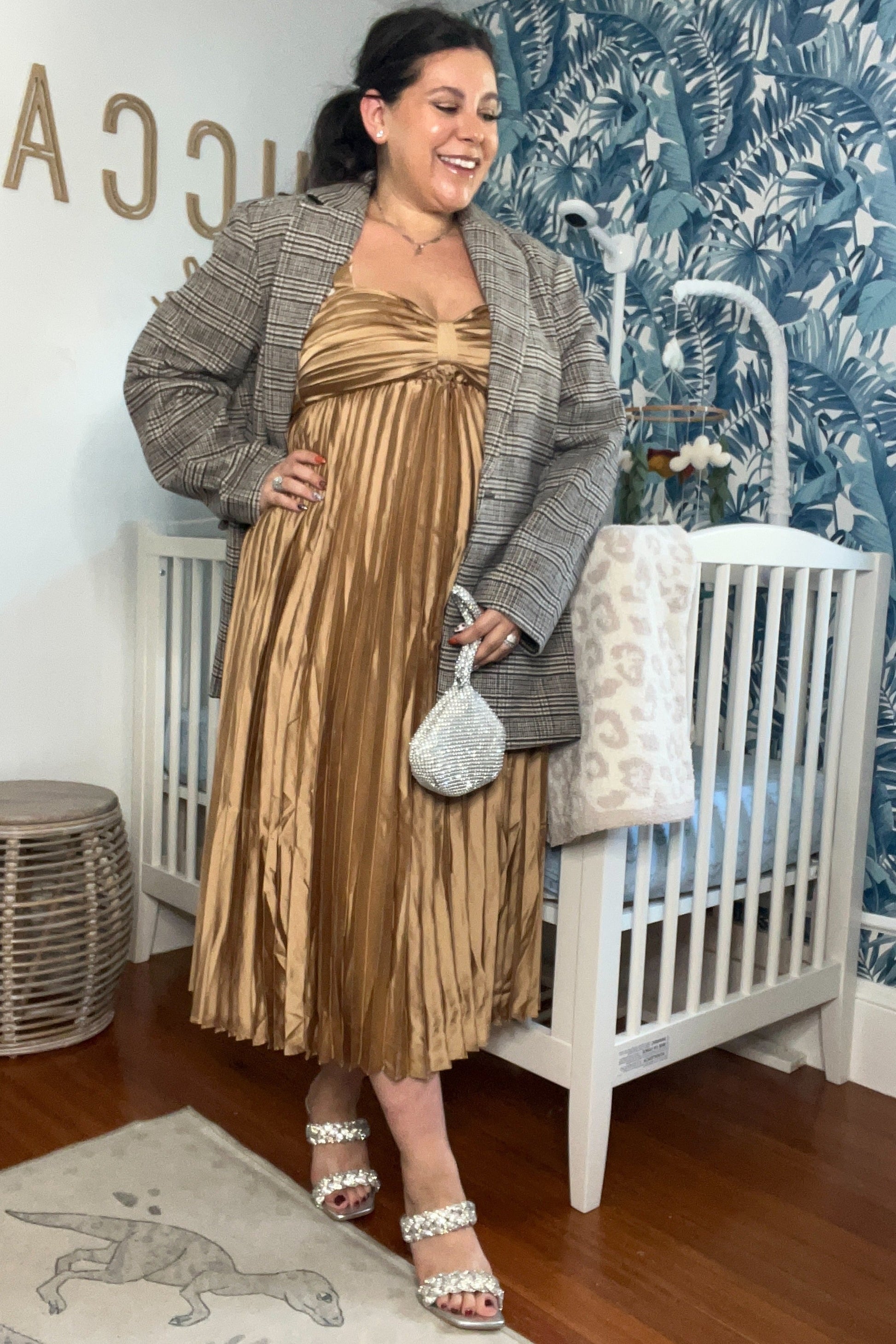 Gold Satin Pleated Sweetheart Maternity Midi Dress