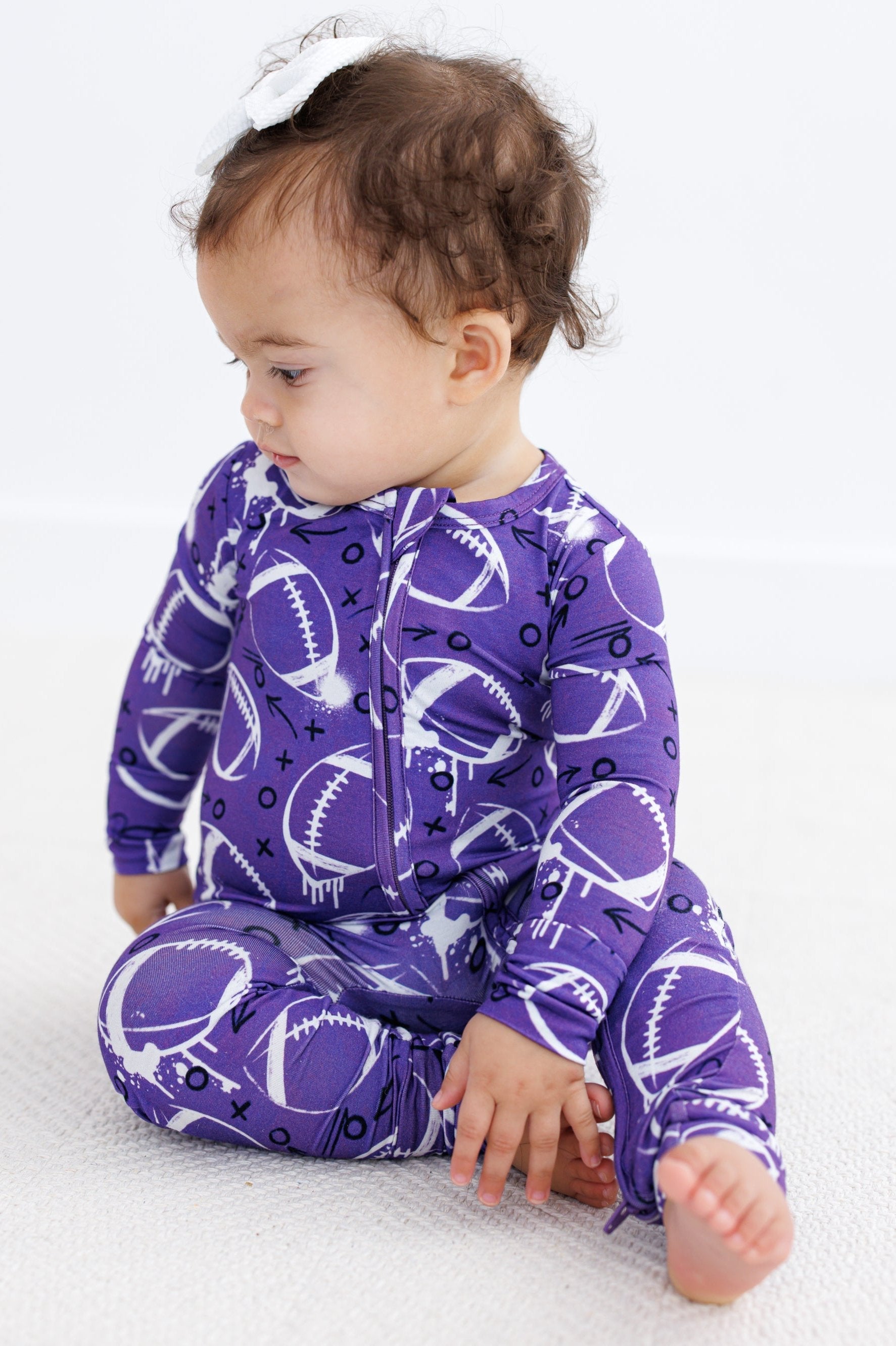 Graffiti Football Convertible Romper : PURPLE AND WHITE