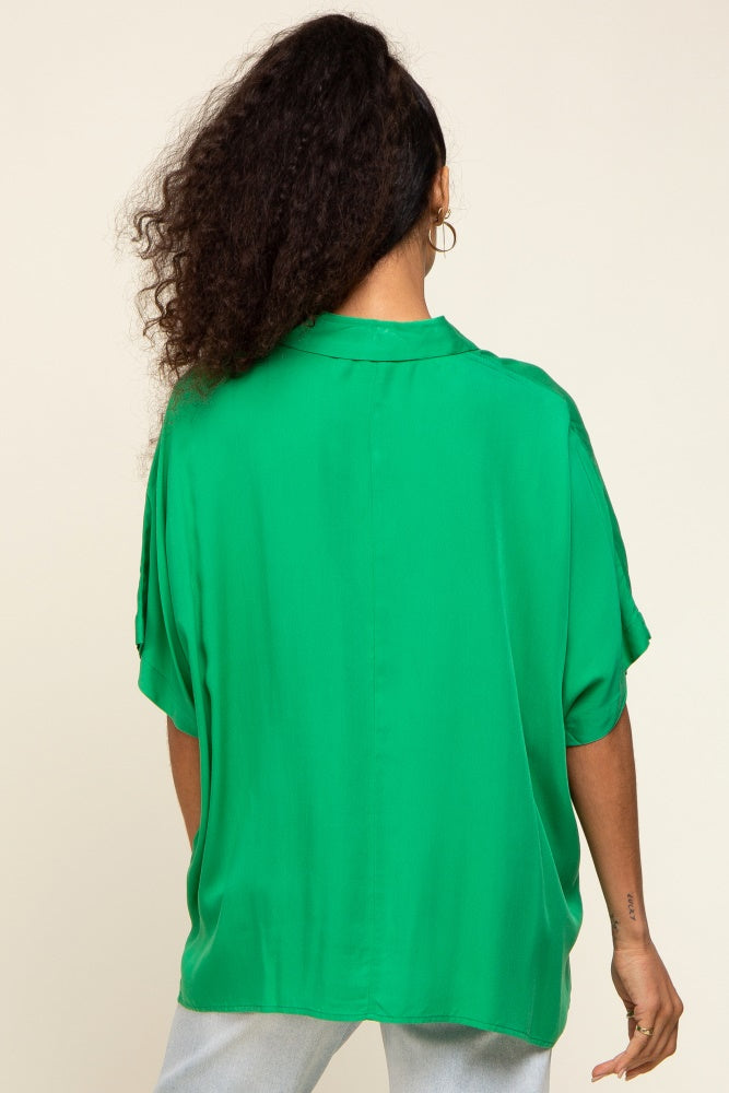A solid hue button up top. Features a collar, front functioning buttons, short dolman sleeves, and side slits at the hem.