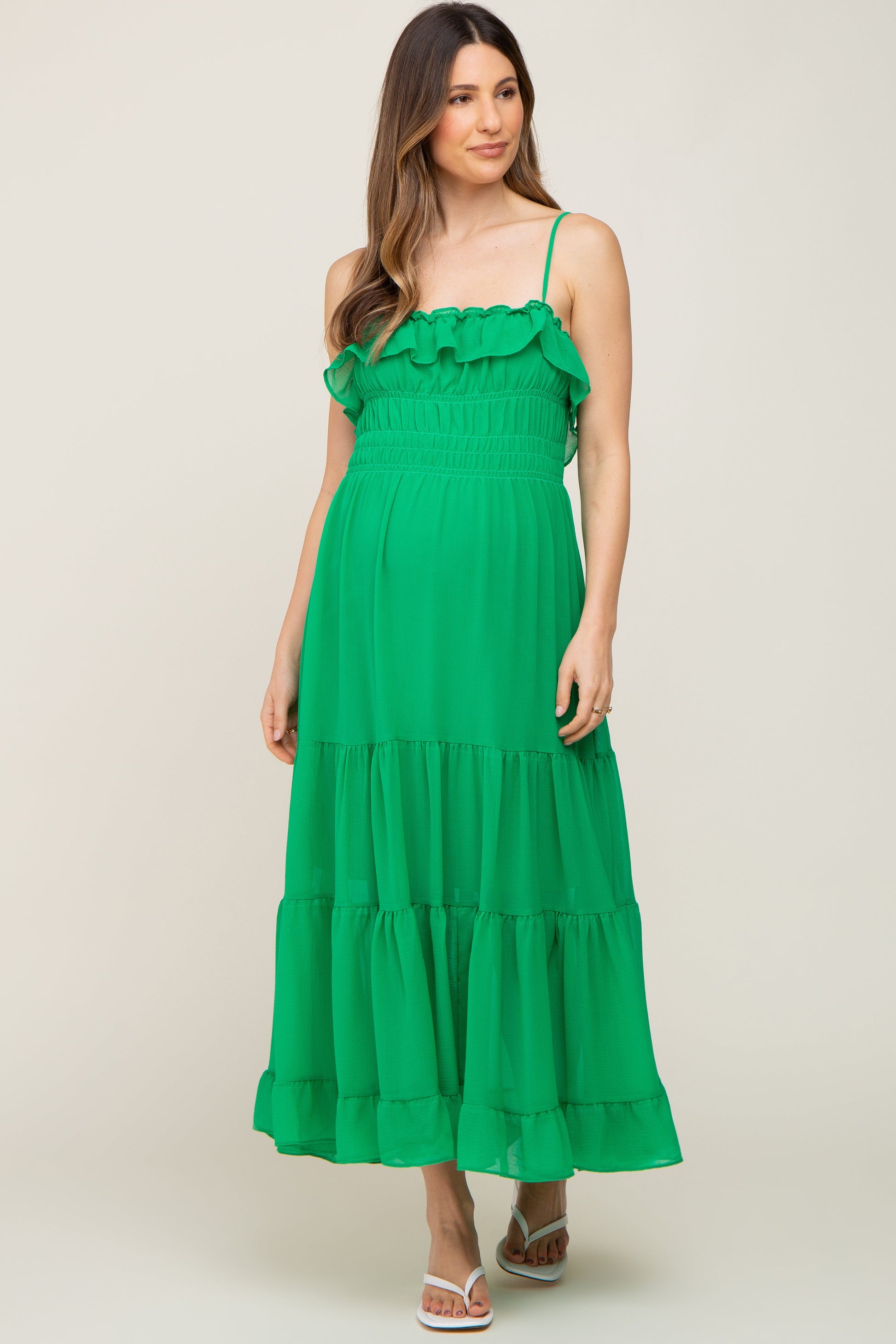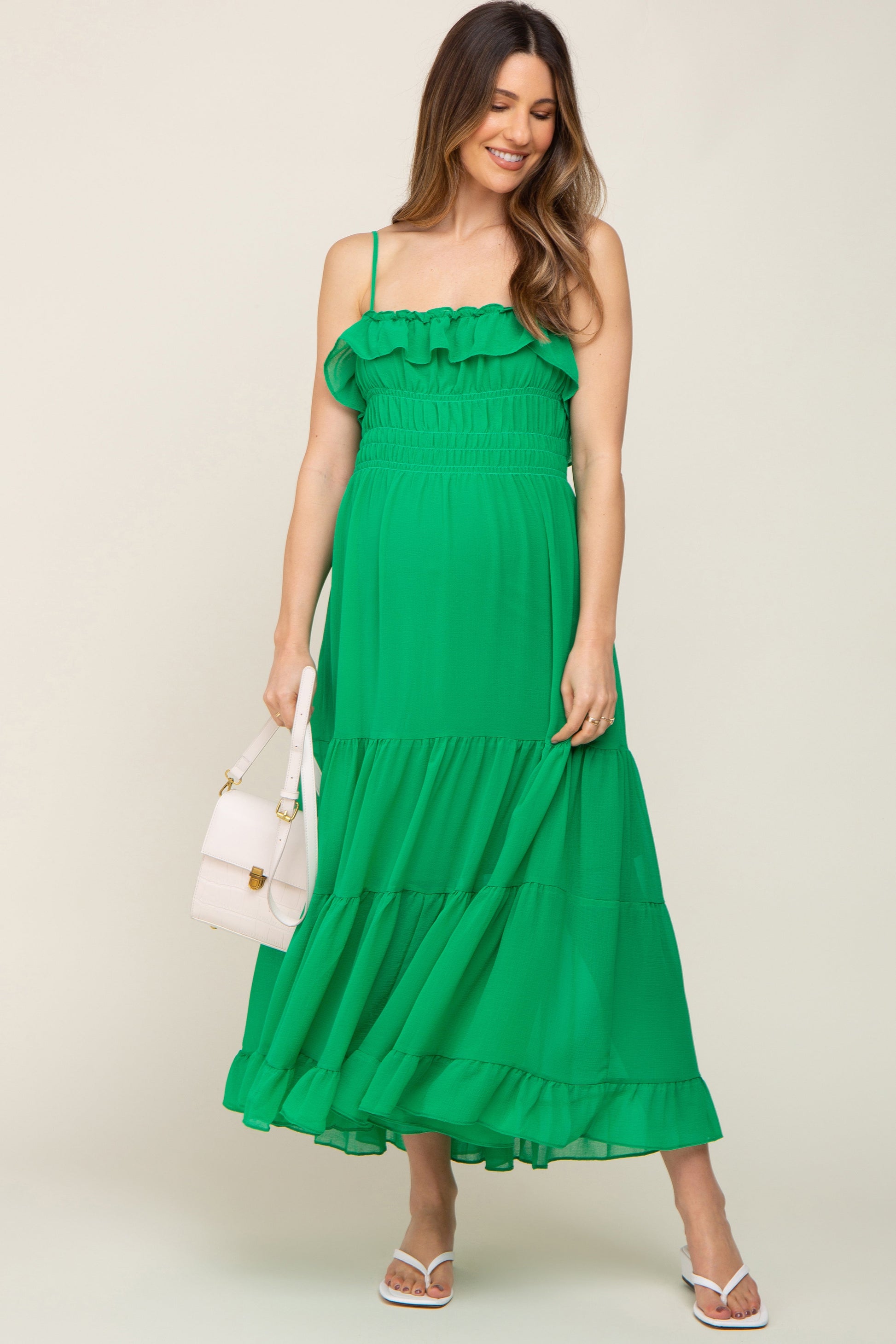 A sleeveless maternity midi dress featuring a back tie that adjusts the straps, a top ruffle trim, a shirred bodice, and a tiered skirt. Dress is partially lined for coverage.