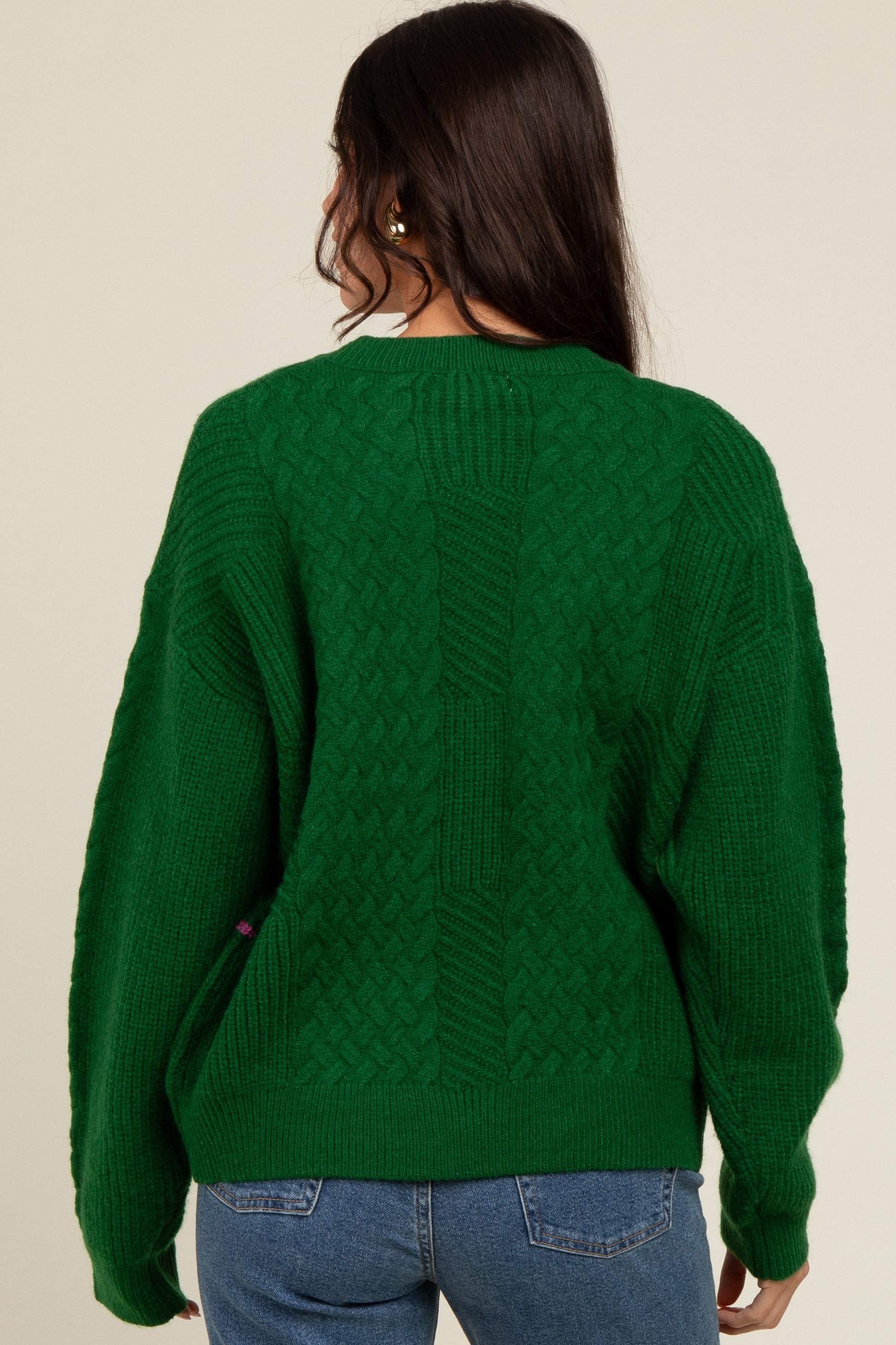 Stay cozy and stylish with our Green Striped Mixed Cable Knit Sweater. Featuring an eye-catching blend of classic cable knit patterns and ribbed stripes, this rich green sweater adds texture and depth to your wardrobe. Crafted from a soft, warm fabric, it promises all-day comfort for cooler days. The relaxed fit and dropped shoulders create a laid-back vibe, while subtle pink stripe accents add a modern twist. Perfect for pairing with jeans or casual pants, this versatile knit is your go-to piece for effortless fall and winter style. Embrace warmth without sacrificing fashion!