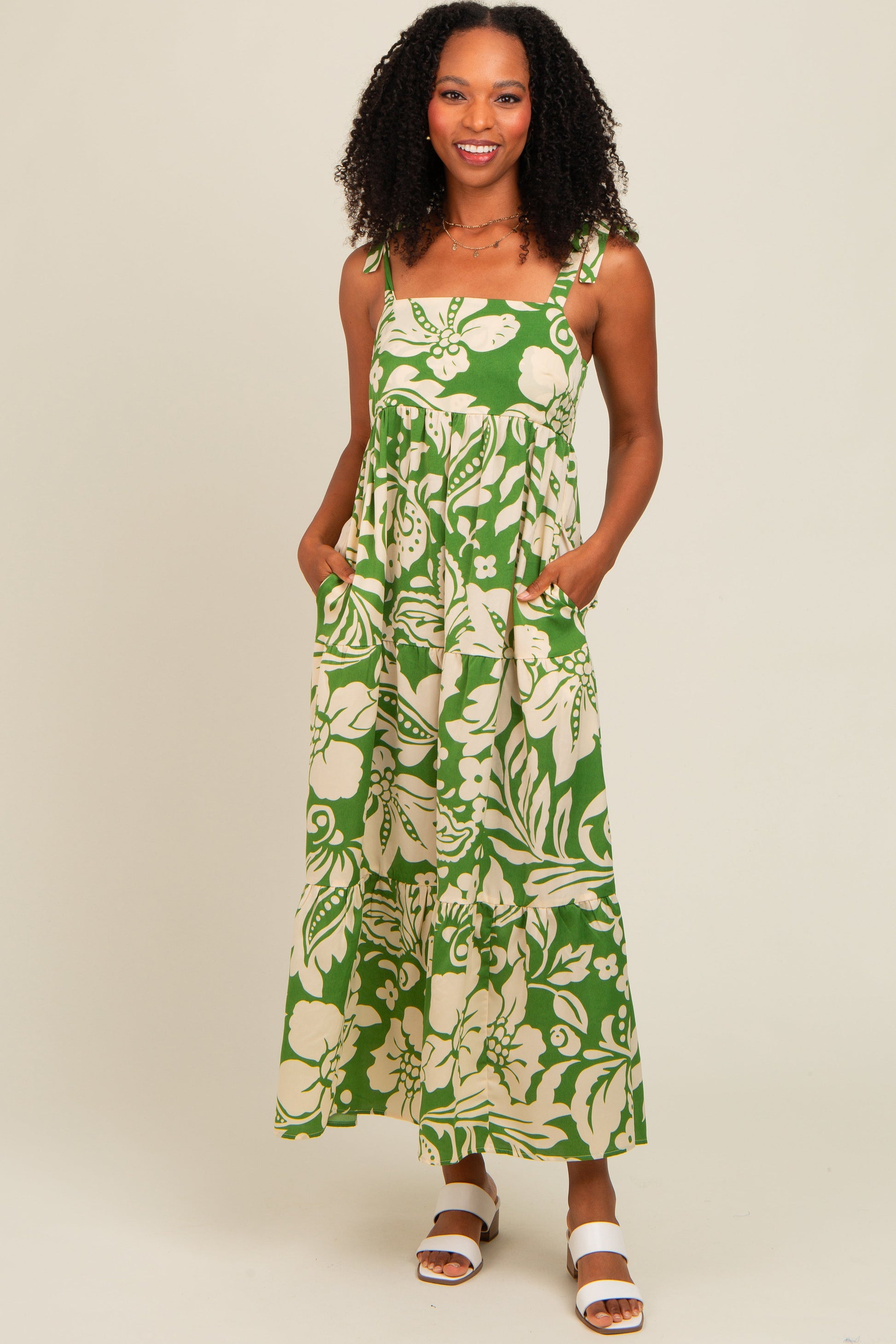 Green Tropical Floral Shoulder Tie Tiered Midi Dress