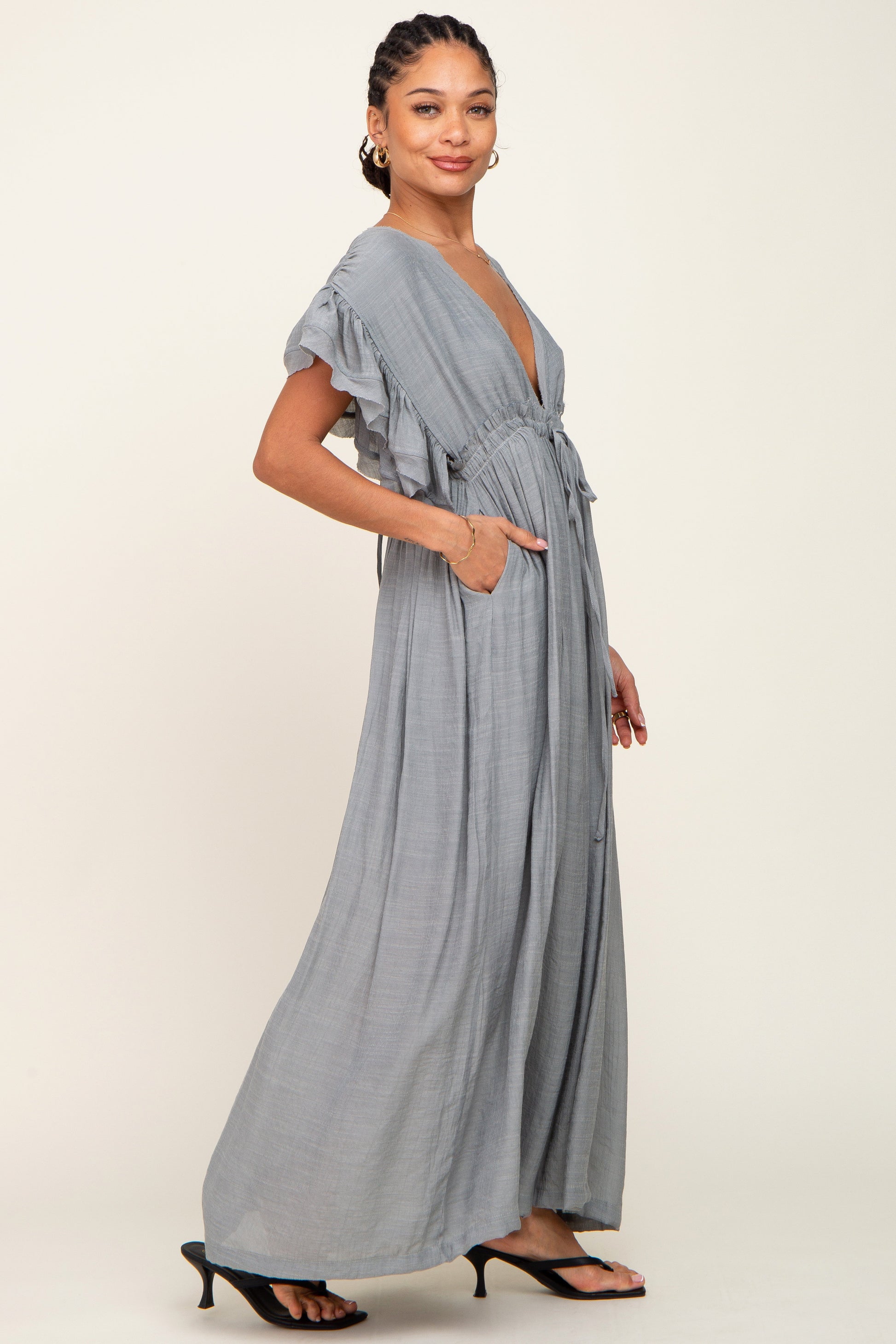 A solid short sleeve maxi dress with a deep v-neckline, ruffle accent sleeves, button down closure in front and tie accent in back. Skirt is partially lined. Pocketed.