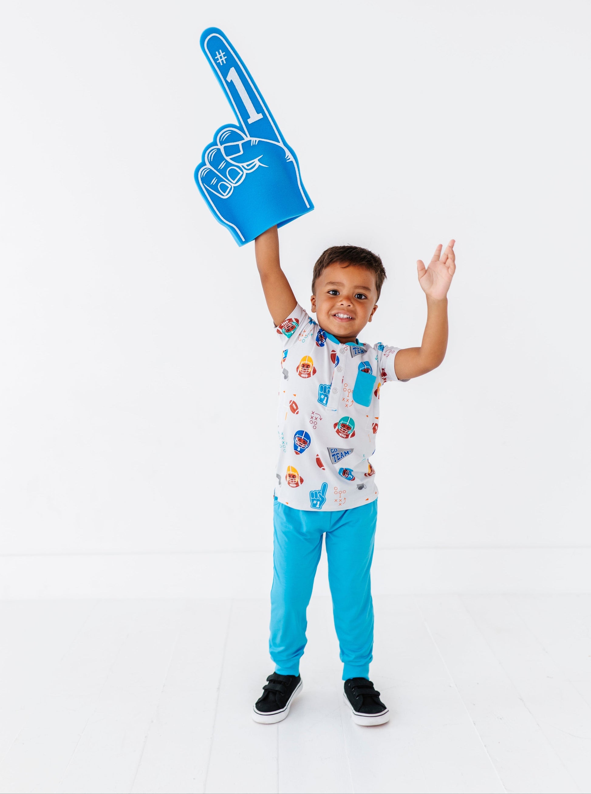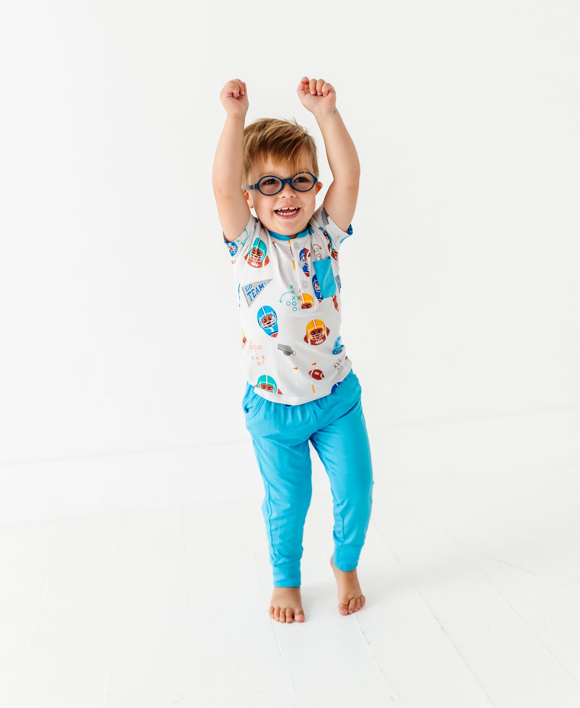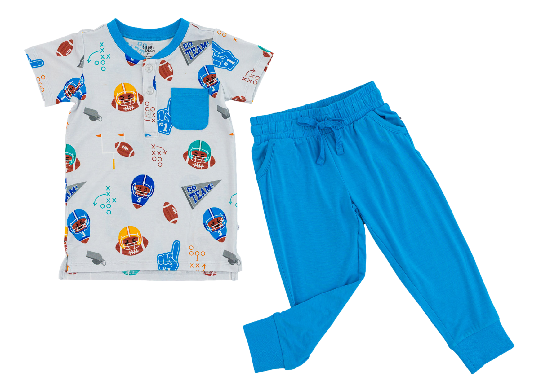 For the kid who’s always ready for kickoff. This play-ready set pairs a buttery-soft bamboo viscose henley with matching stretchy joggers. The tee features football helmets, playbook doodles, whistles, foam fingers, and a bright contrast pocket — topped with a comfy snap/henley placket. Joggers have an easy elastic waist and pockets for treasures.