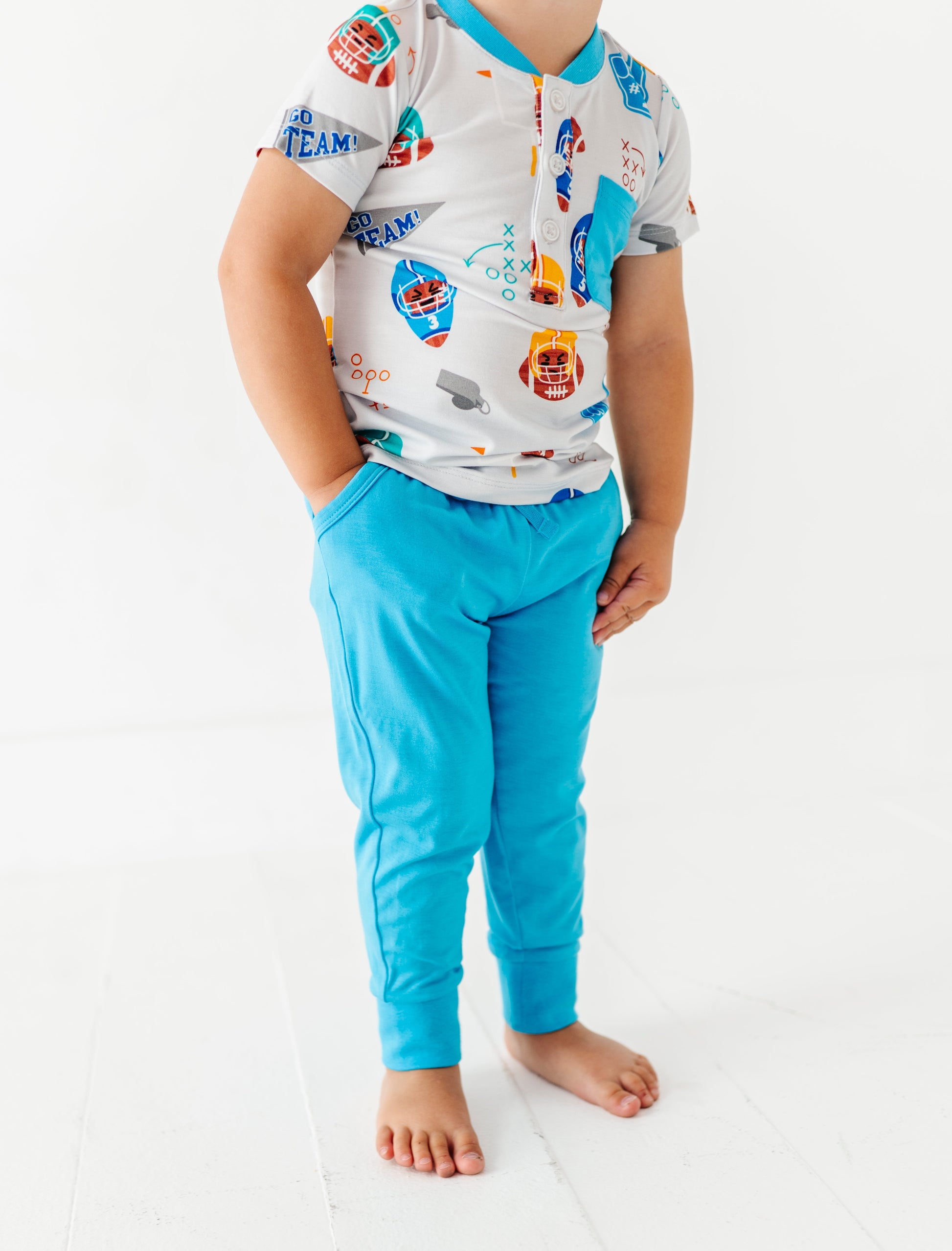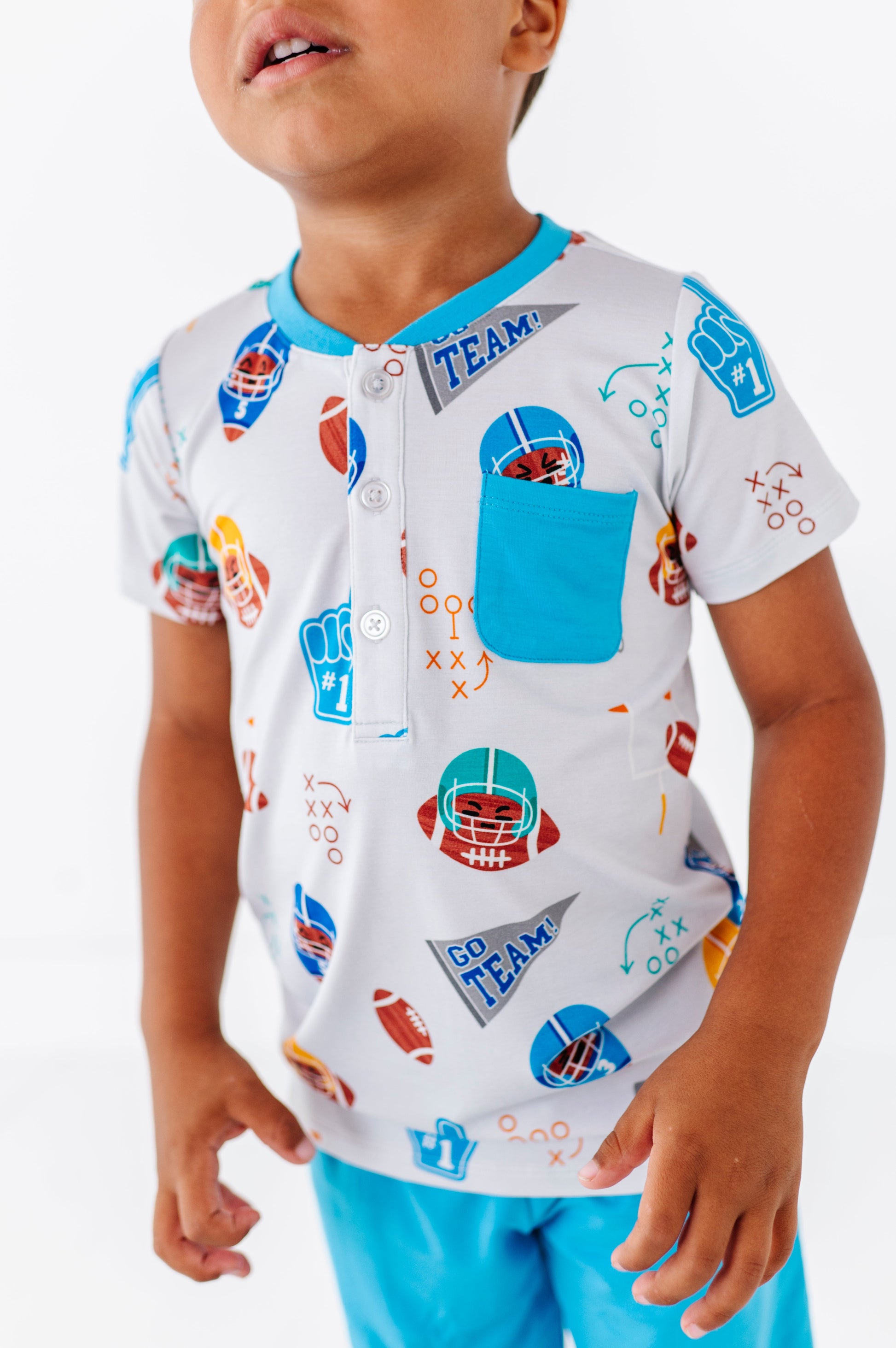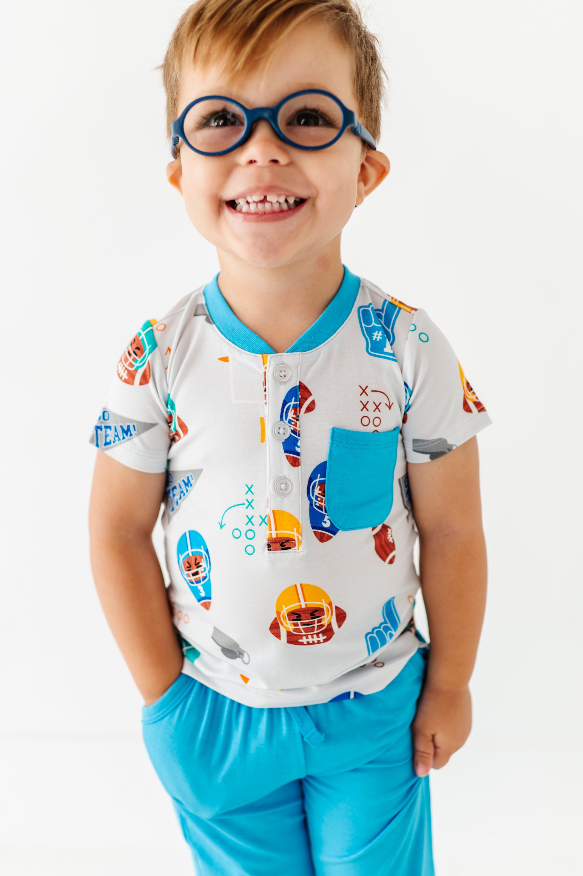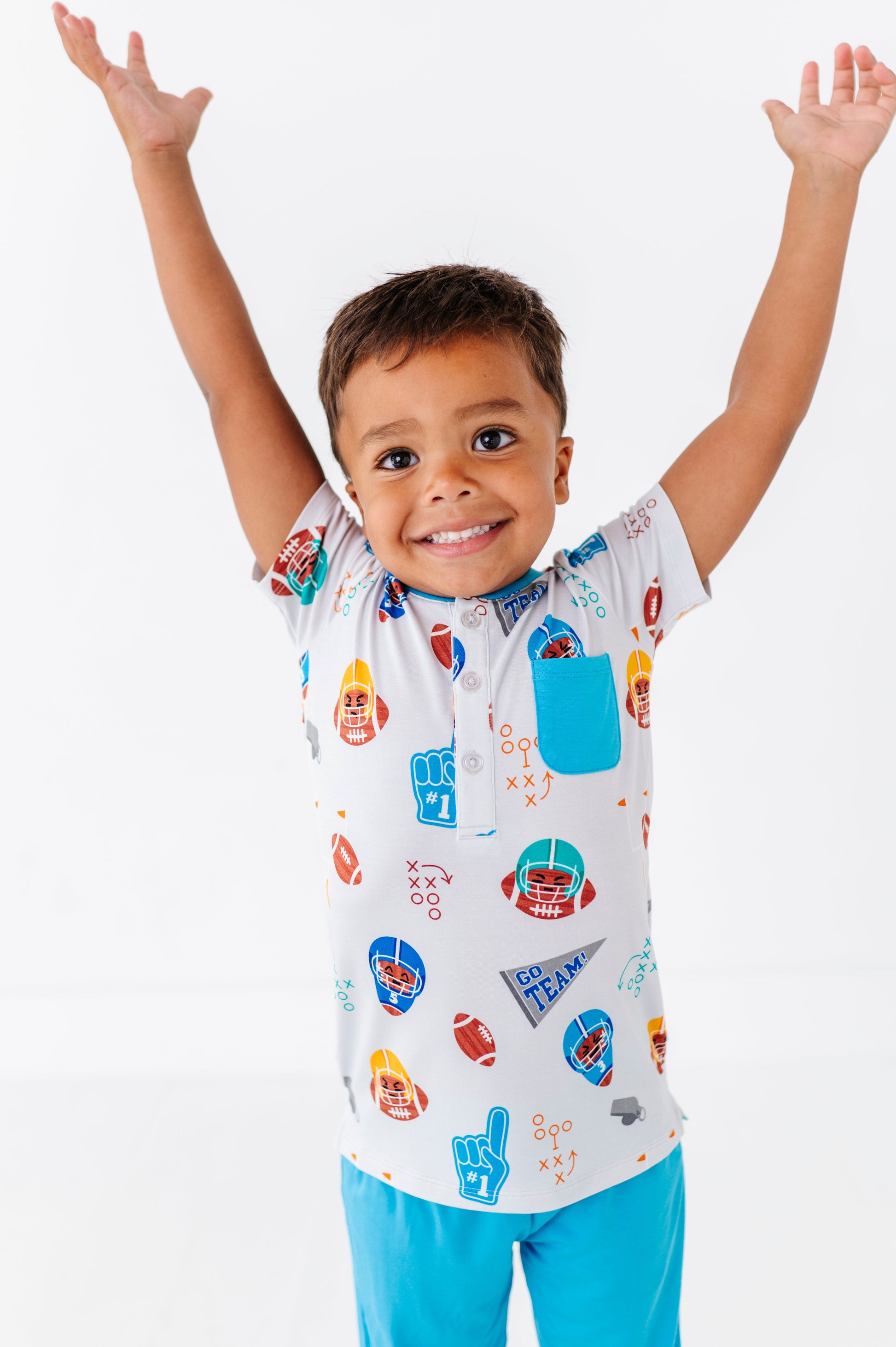 For the kid who’s always ready for kickoff. This play-ready set pairs a buttery-soft bamboo viscose henley with matching stretchy joggers. The tee features football helmets, playbook doodles, whistles, foam fingers, and a bright contrast pocket — topped with a comfy snap/henley placket. Joggers have an easy elastic waist and pockets for treasures.