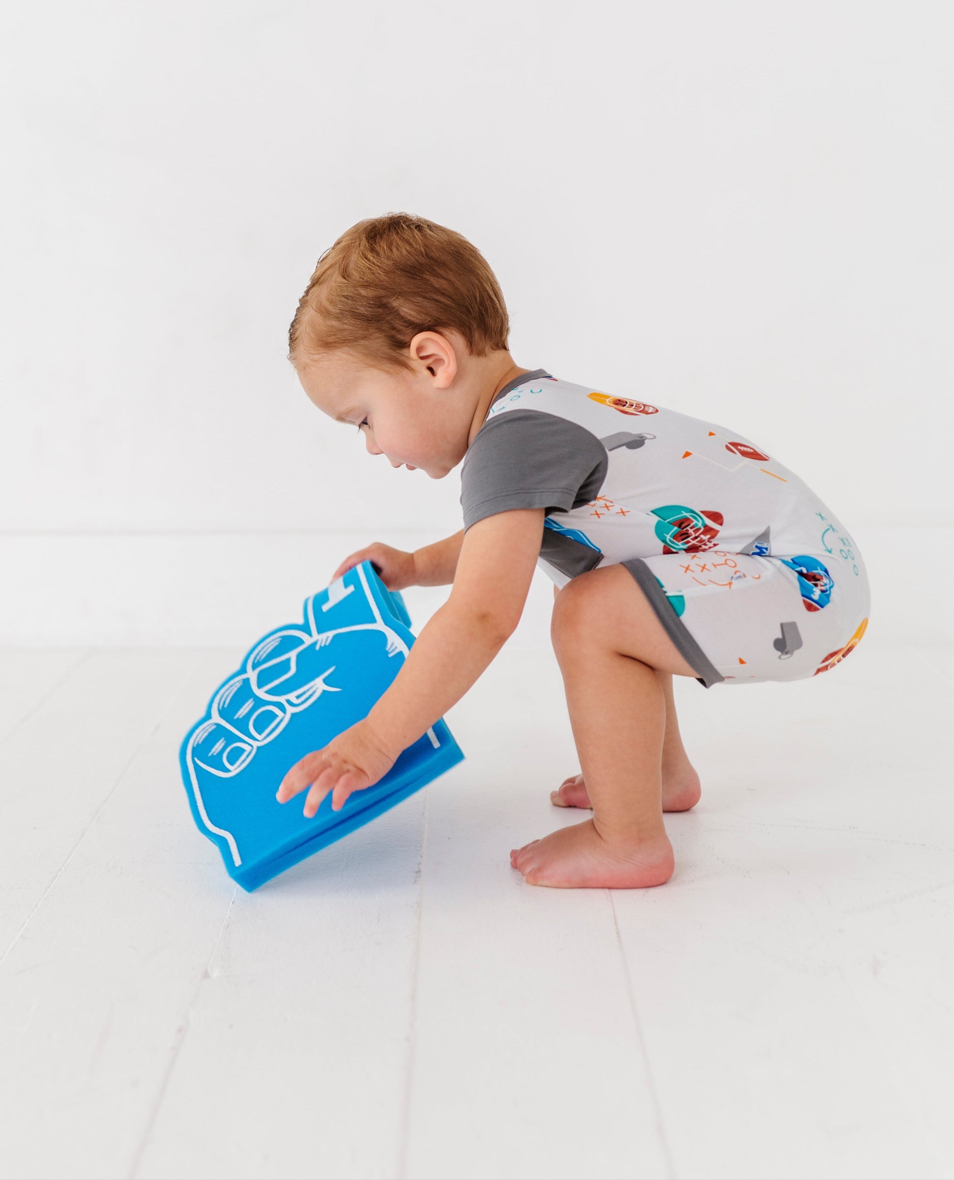 For the little MVP. This play-ready romper scores big with a buttery-soft bamboo viscose blend and an easy 2-way zipperfor lightning-fast changes. The allover football helmets, playbook doodles, whistles, goalposts, foam fingers, and a “Go Team!” pennant bring the sideline hype—finished with contrast sleeves, trim, and a tiny chest pocket.