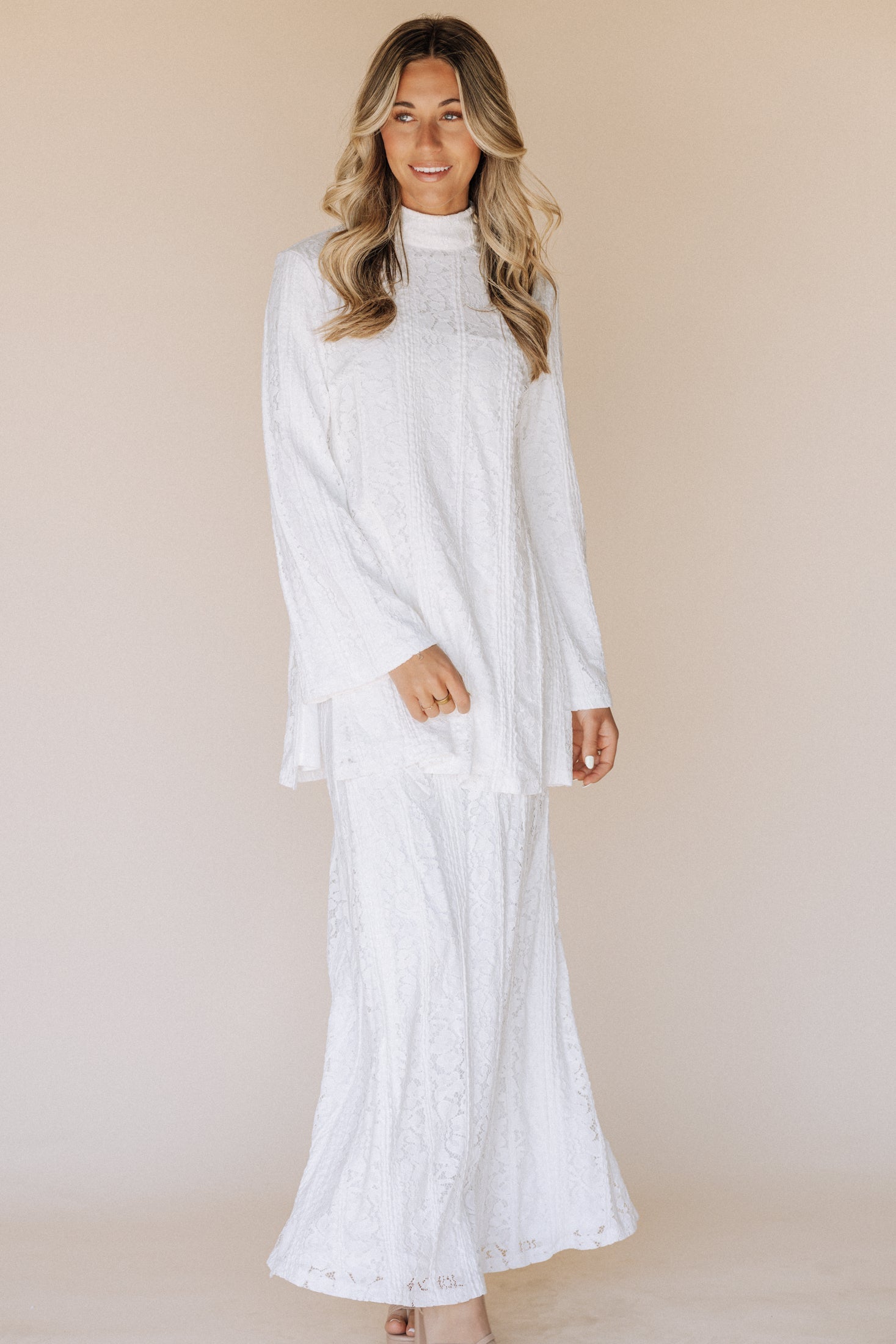 Upgrade your temple dress game with the Hadley Temple Set. Featuring a high neck, long sleeve top and maxi skirt with delicate lace details, this set is the epitome of elegance and exclusivity. Stay comfortable and stylish while honoring your faith in this sophisticated and luxurious piece.