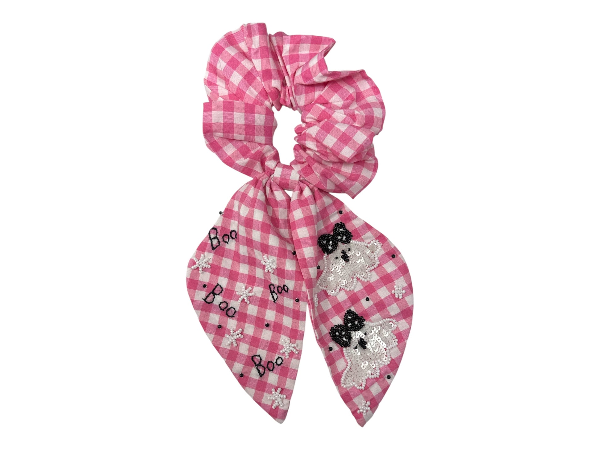 Spook it up in style with our Pink Gingham Ghost Scrunchie Scarf! Featuring a playful pink checkered print, this festive scrunchie is adorned with sequin ghost appliqués, beaded “Boo” accents, and dainty floral embroidery. The attached scarf ties add a charming finish—perfect for Halloween season or a cute and quirky everyday look.