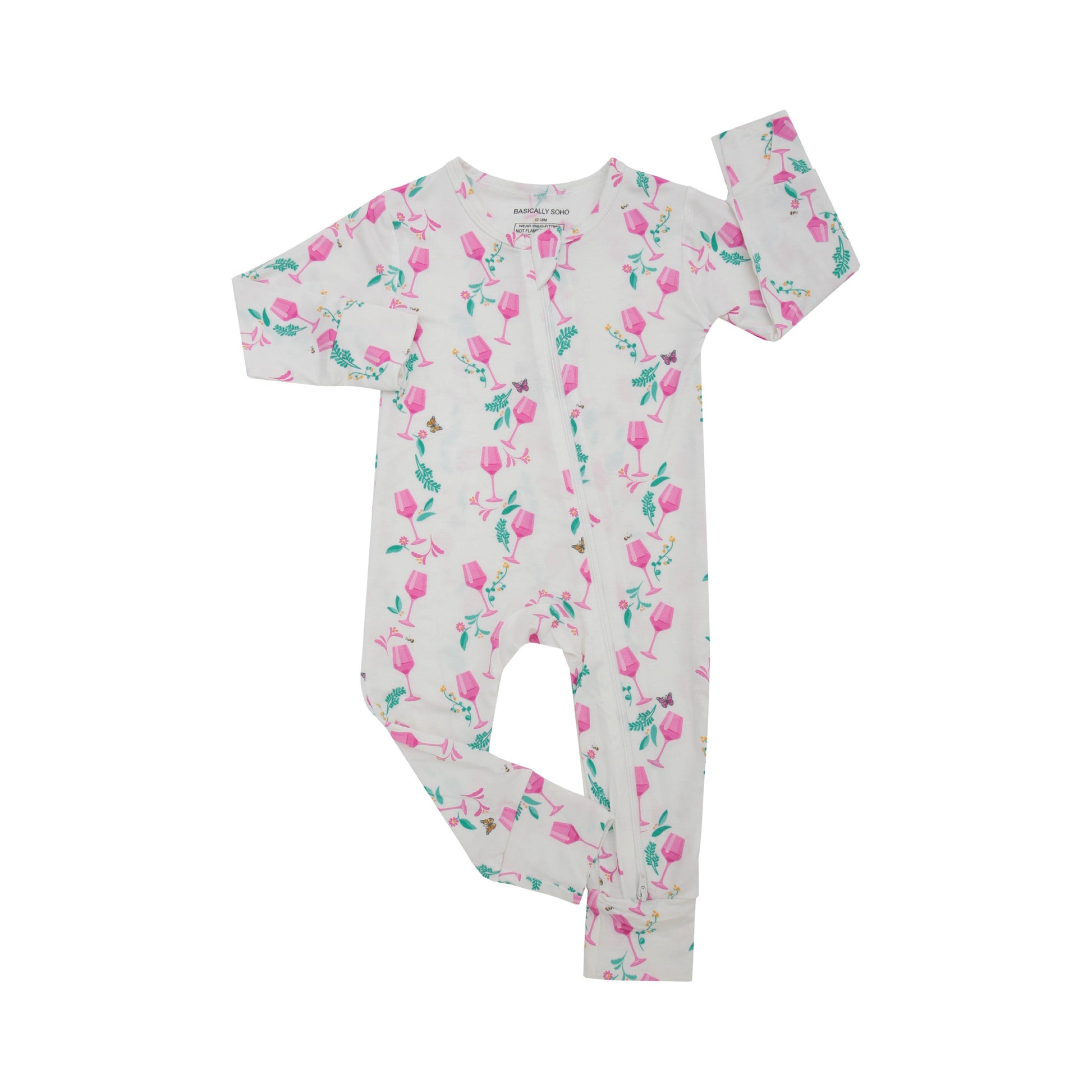 Upgrade your toddler's sleepwear with our super soft bamboo zippered romper! Our Rosé zippered romper is inspired by the iconic Wölffer Estate Vineyard in Sagaponack. We love the clean white background with the pink rosé wine glasses and green vineyard vines. This print is “summer in a bottle.”