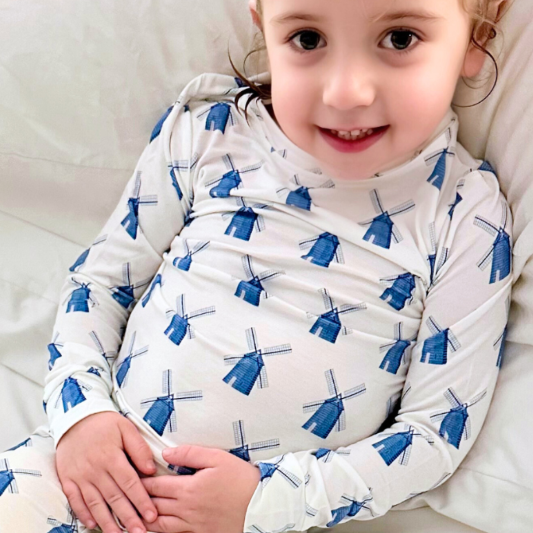 Upgrade your toddler's sleepwear with our super soft bamboo two-piece set! Our Windmill pajama set is inspired by the iconic Hook windmill in East Hampton. We love the clean white background with the slate blue / gray windmill print. This print will transport you to your favorite coastal town.