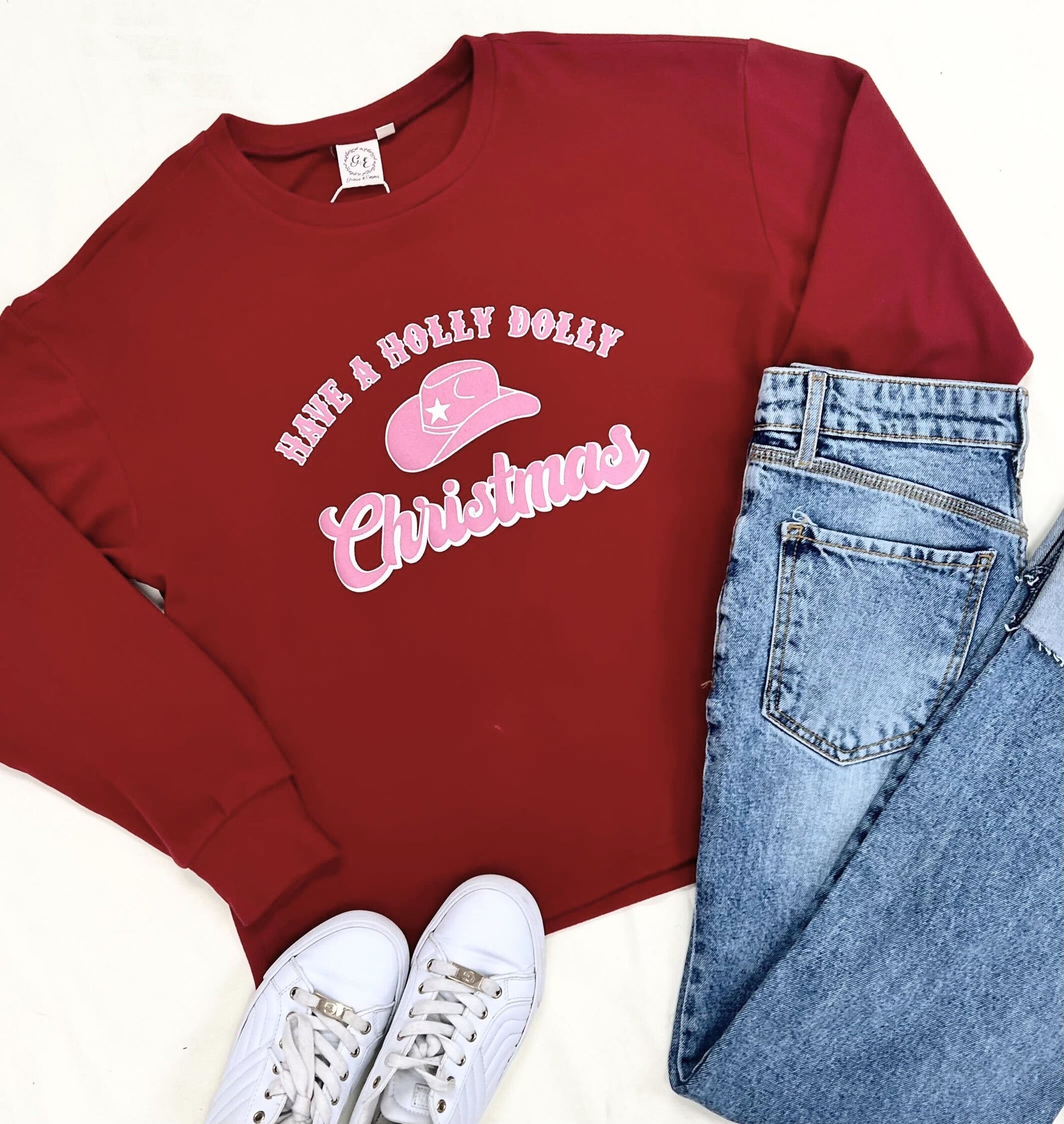 "Have a Holly Dolly Christmas" on Red Crazy Cozy Microfleece Crewneck