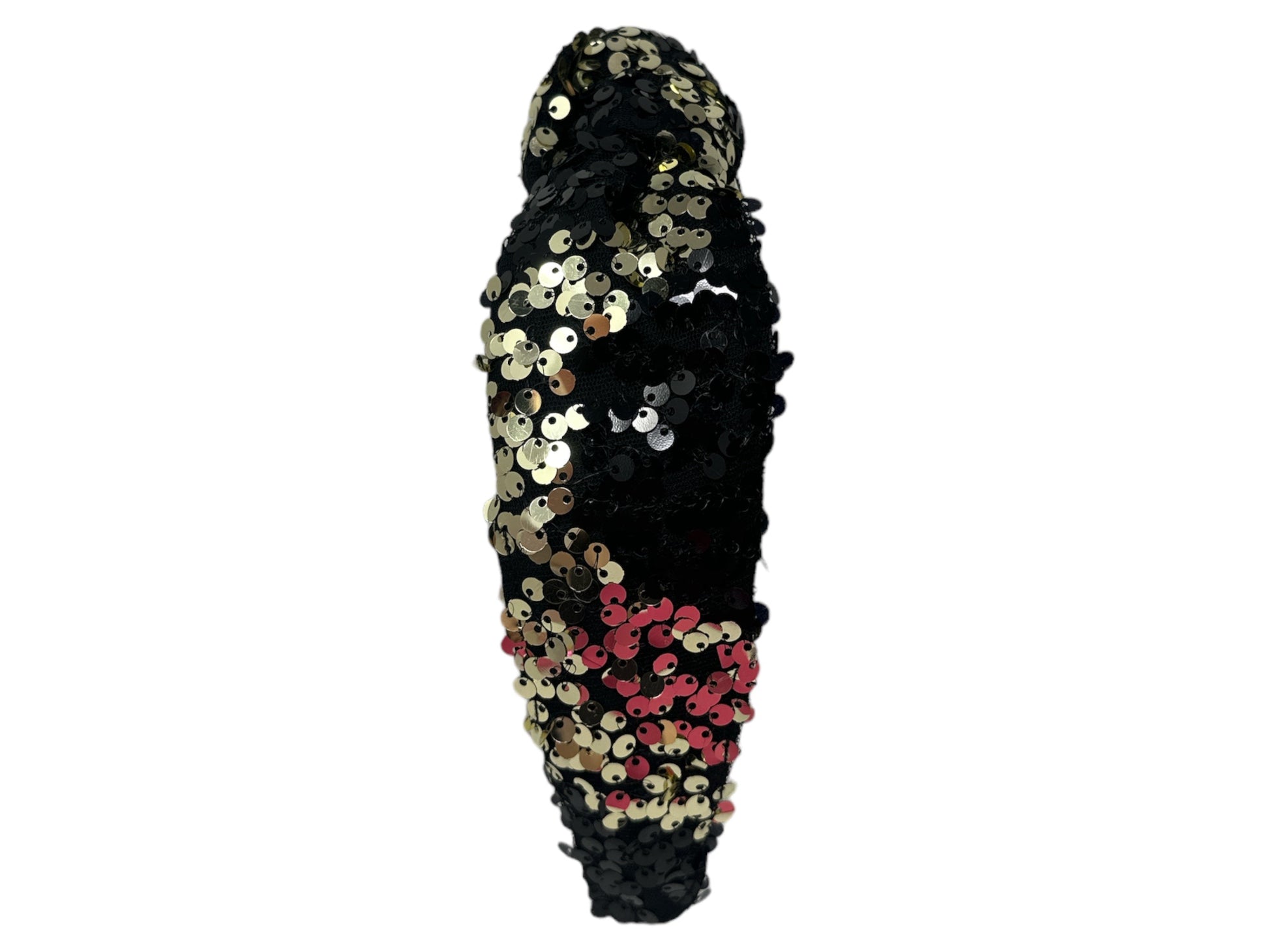 Black and gold sequin material. The gold sequins swirl around the headband.