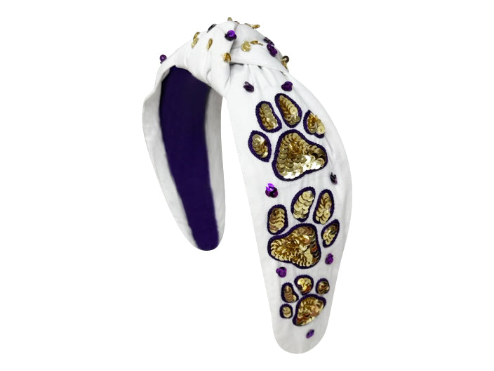 Show your pride with a pop of sparkle in our Sequin Paw Knot Headband – Purple! Featuring shimmering purple sequins and a bold paw print design, this headband is perfect for fans, school spirit events, or anyone who loves a little sparkle. The knotted style ensures a comfortable fit while adding a fun and festive flair to any outfit.