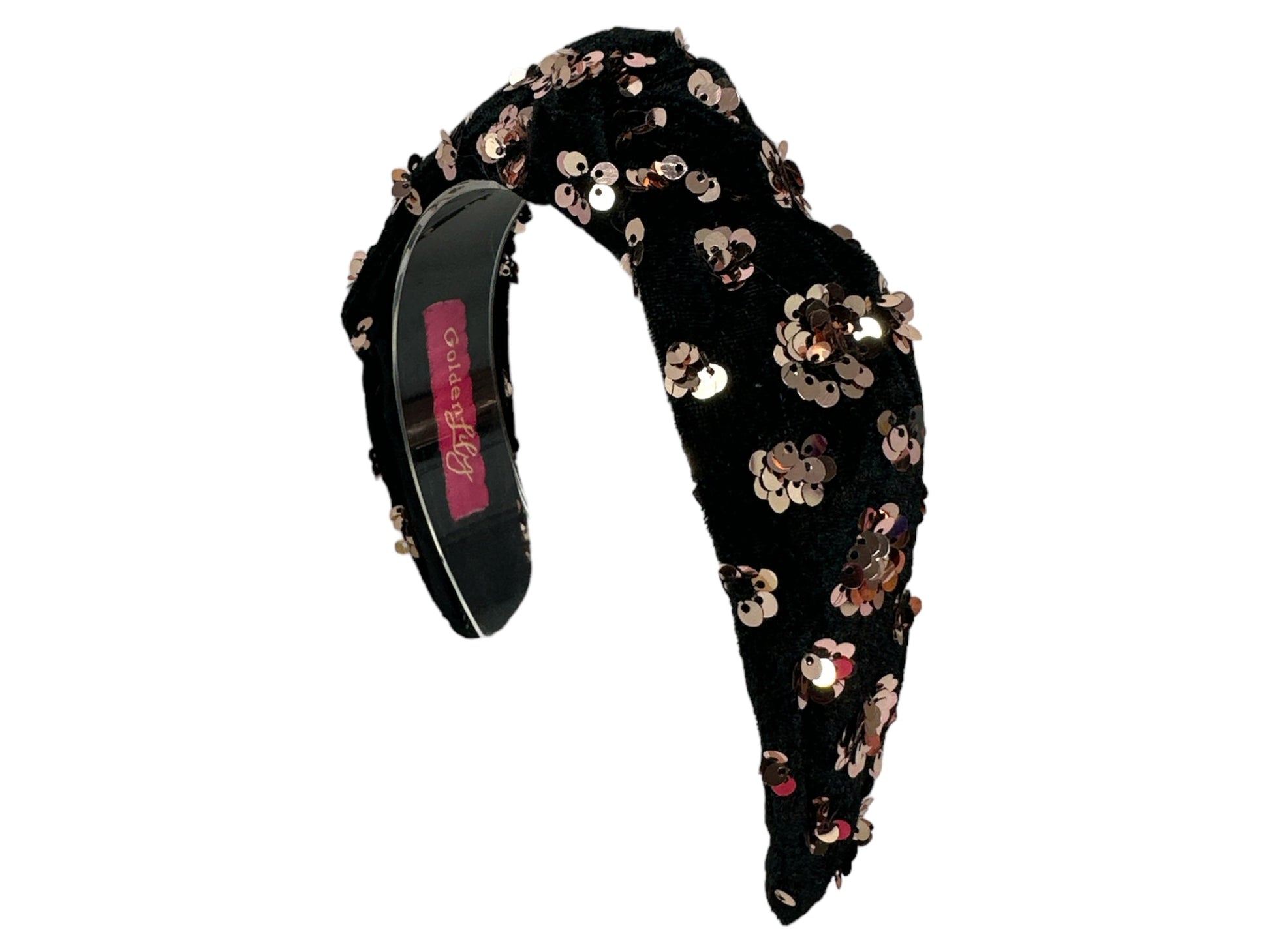 Velvet knot headband with rose gold sequin circle detail.