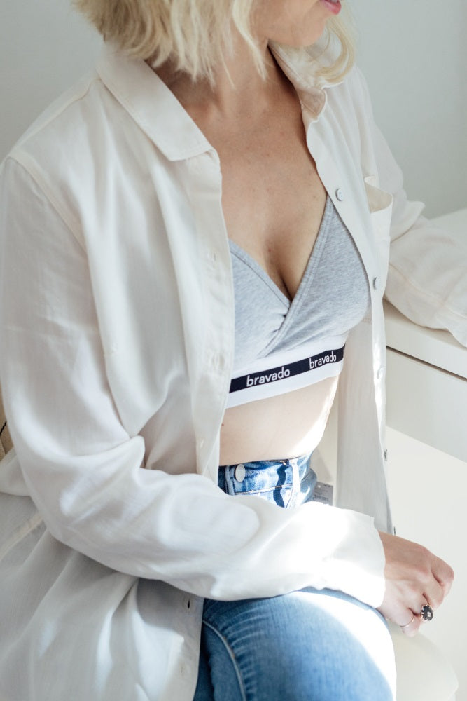 A colorblock nursing bra. Wire free. Adjustable straps.