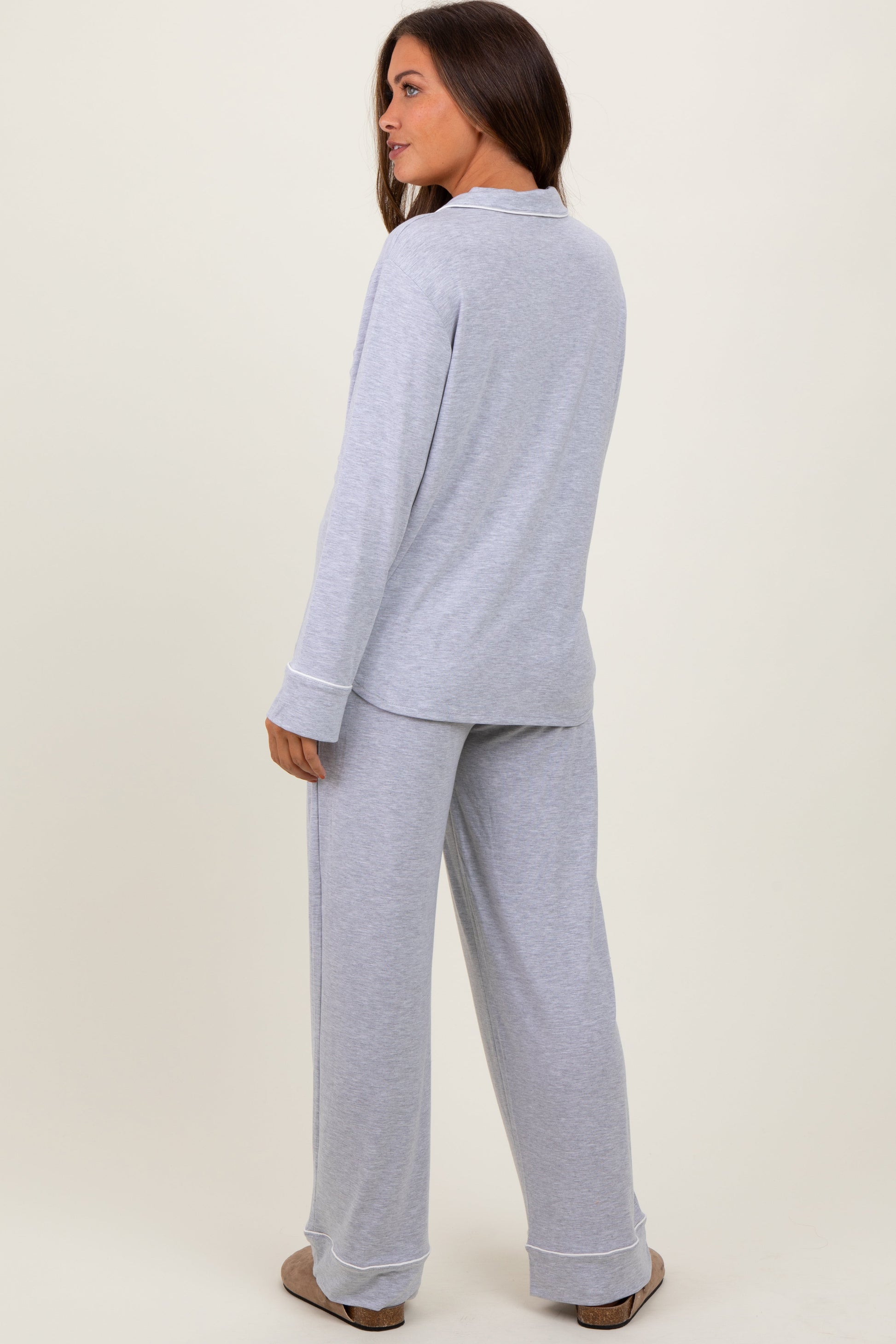 Heather Grey Button Down Top Wide Leg Pant Maternity Pajama Set