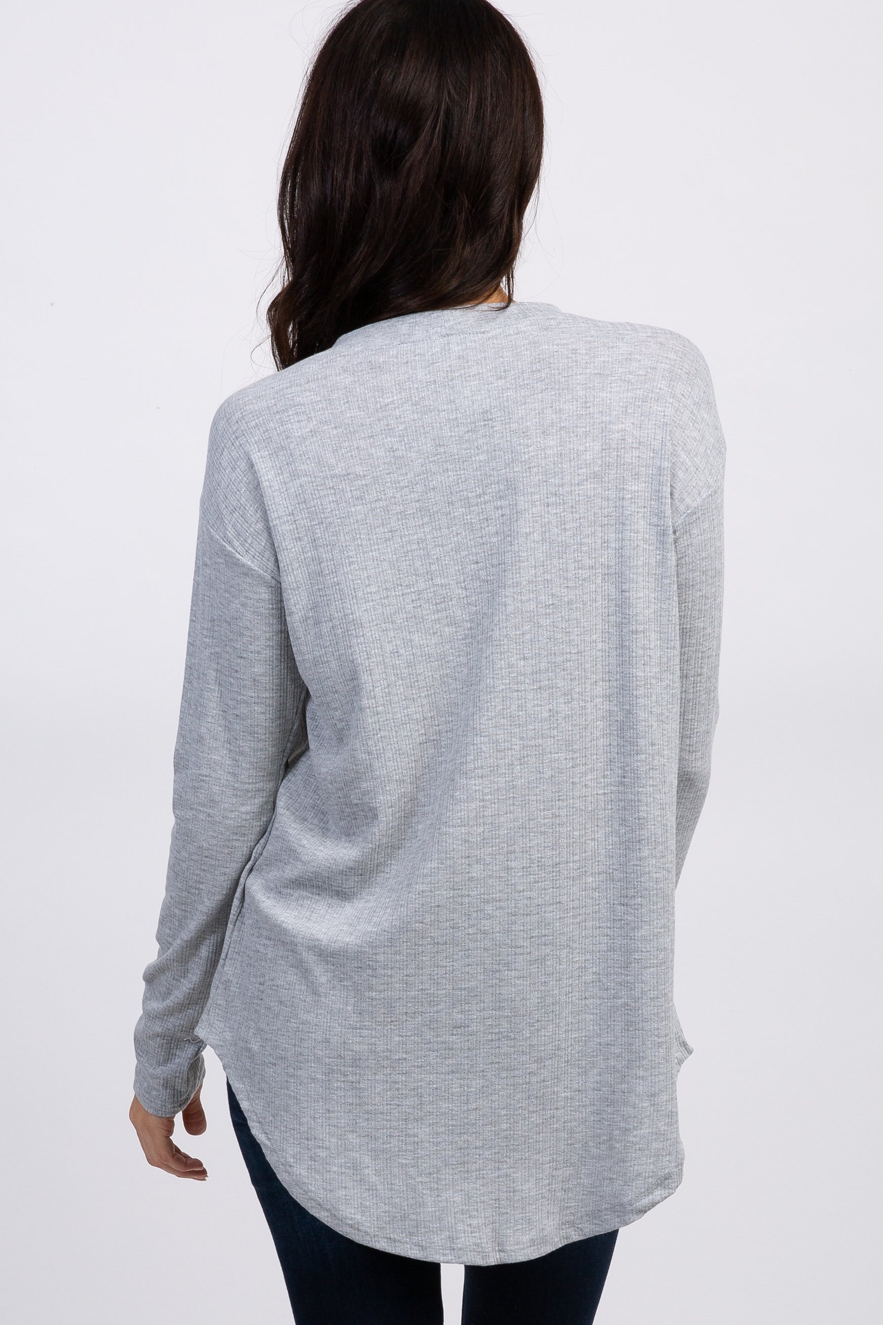 A solid hued top featuring a ribbed texture, long sleeves, a curved hem, and a rounded neckline.