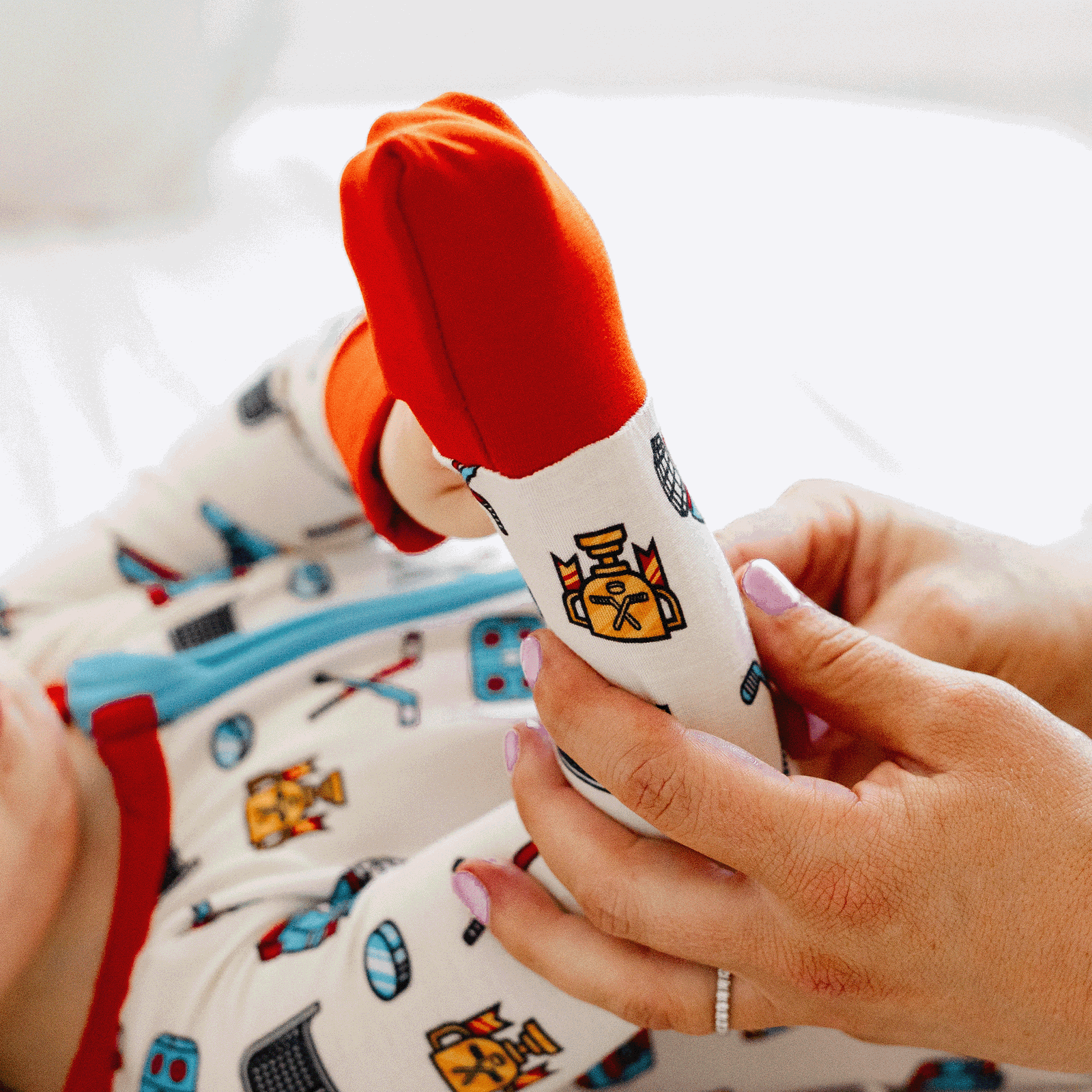 - Playful hockey-themed all-over print