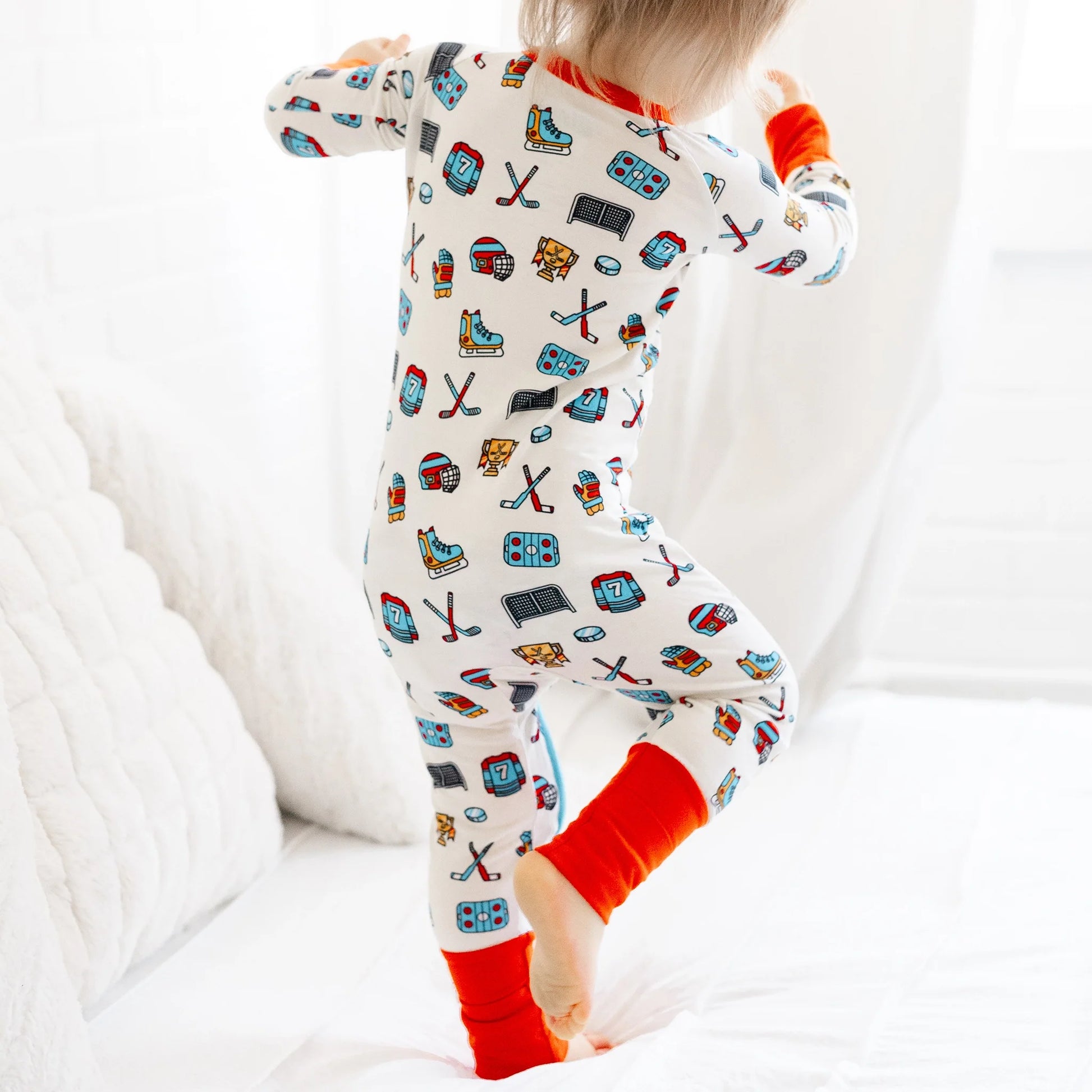 Suit up your future all-star in our ultra-soft Hockey One-Piece. Made from breathable bamboo fabric, this cozy sleeper is perfect for power naps, playtime breakaways, or cheering from the couch during hockey season. With an all-over print featuring pucks, sticks, and skates, itโs a fan-favorite for any mini MVP.