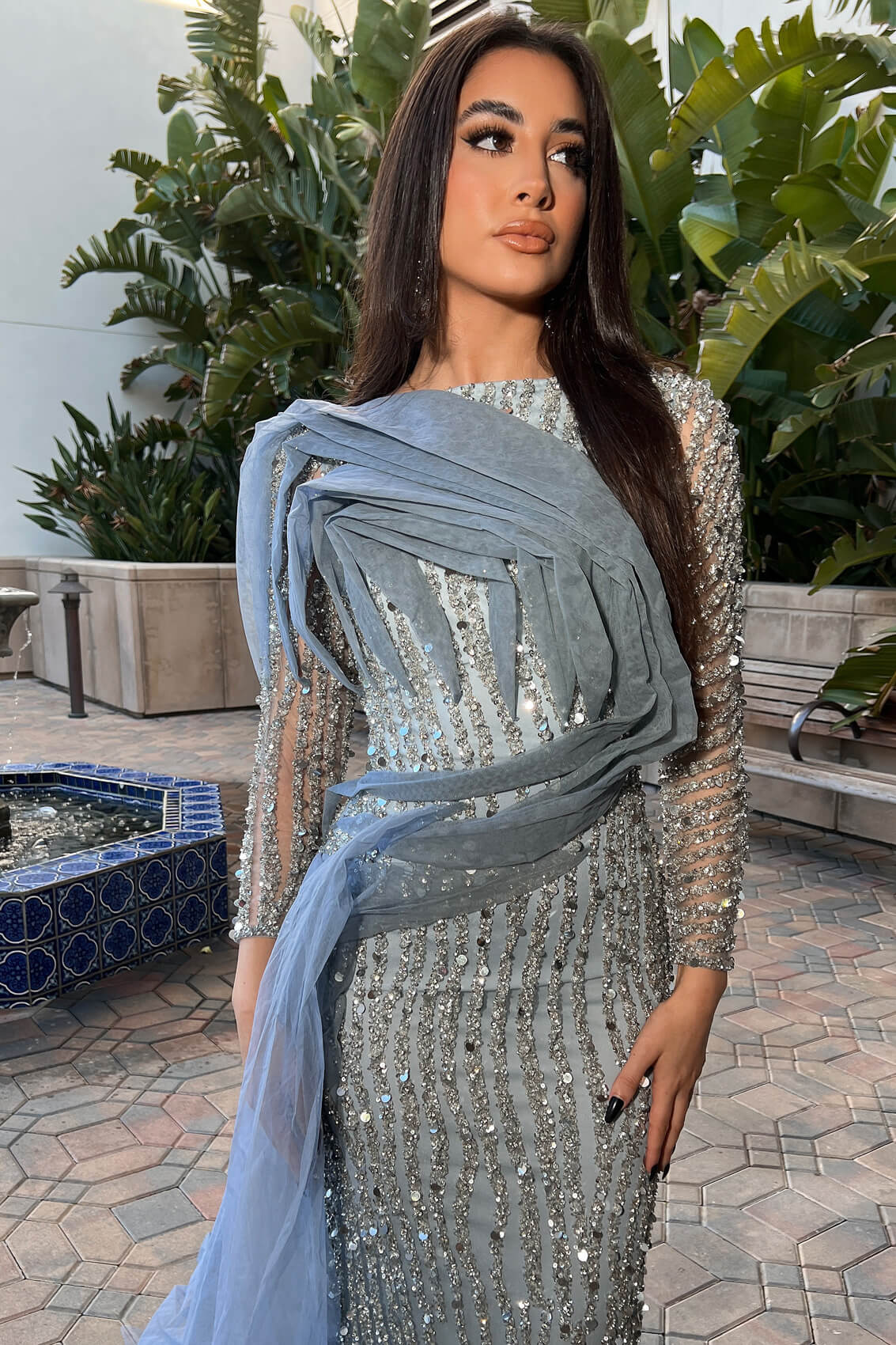 The Imani Long Sleeve Side Skirt Dress is perfect for the girl looking for a stunning modest dress! This smokey blue dress is fully lined (except sleeves!) and features a fun tulle side skirt. The Imani Dress bodice features a dramatic draping of tulle along the chest, to give the extra-ness to this gown. This long sleeve dress also features a long train and side skirt. This is perfect for someone looking for a more modest, style, but wanting a youthful, dramatic look. The Imani Long Sleeve Side Skirt Dress is one of a kind dress cannot be found anywhere else.