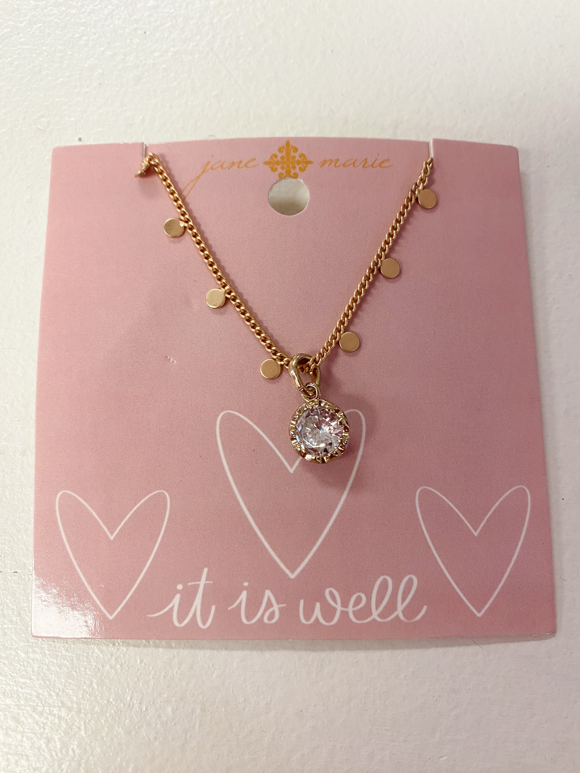 it is well necklace, crystal charm necklace, dainty gold necklace, Jane Marie necklace, boutique inspirational jewelry, faith jewelry for women, simple gold necklace