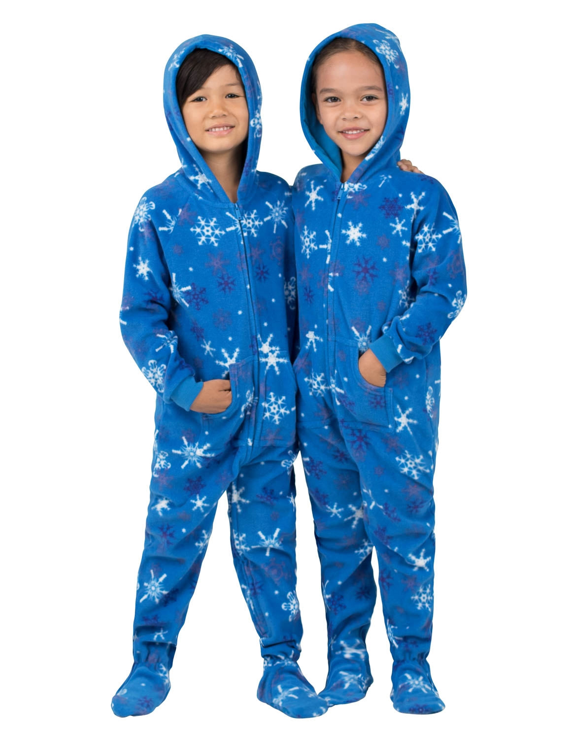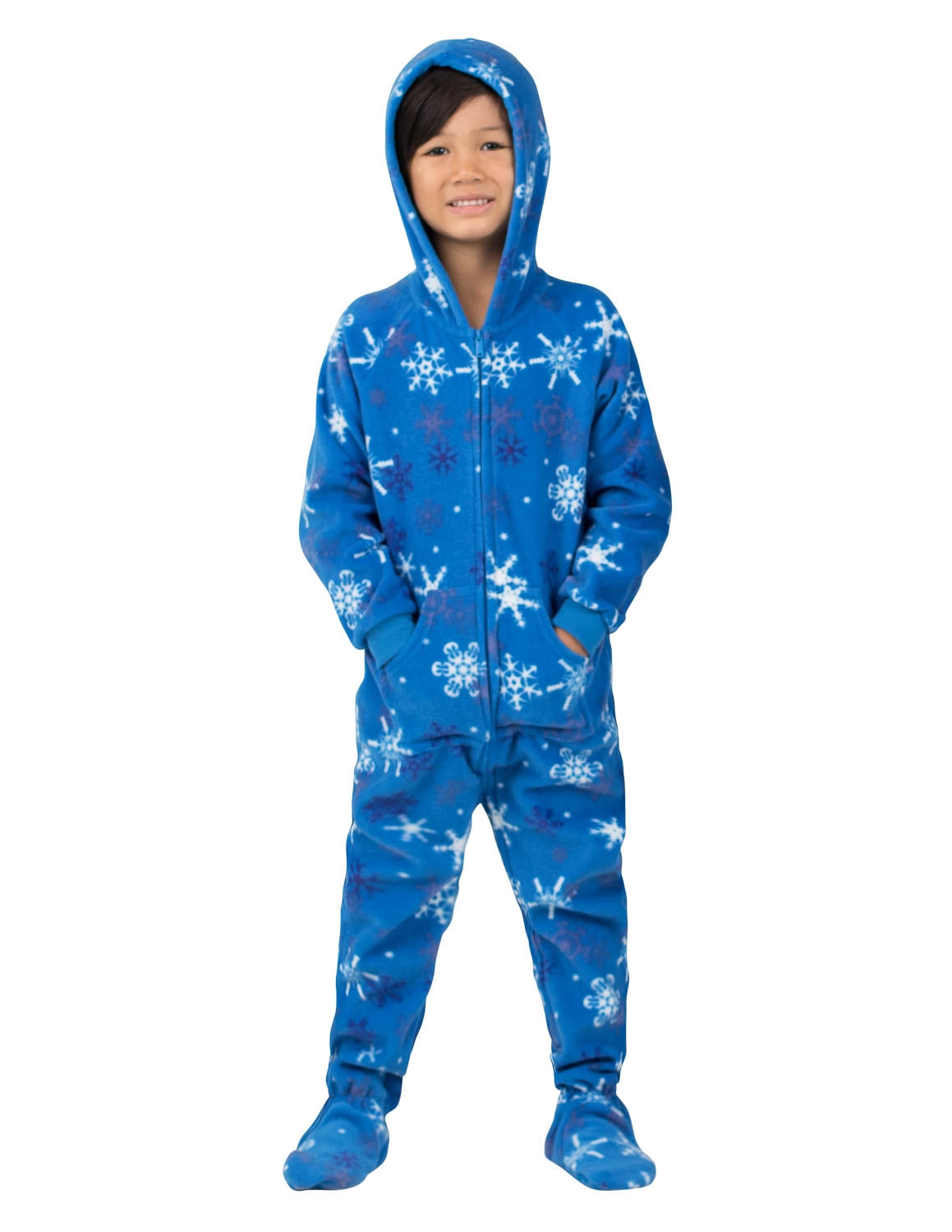 White, blue and grey snowflakes dance around and fall all over these winter blue footed hooded pajamas for babies. Ultra-cozy, soft polar fleece warms bodies and spirits on even the coldest and chilliest of days. Bundle your little one up for sleeping tight in these amazingly comfortable and classic onesie pajamas for infant boys and girls.