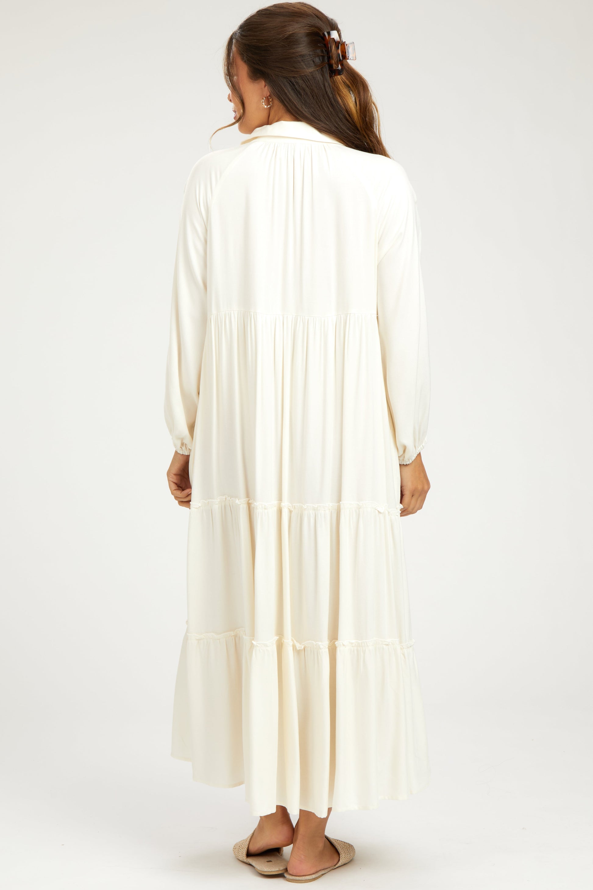 Ivory Button Front V-Neck Ruffle Tiered Maternity Midi Dress