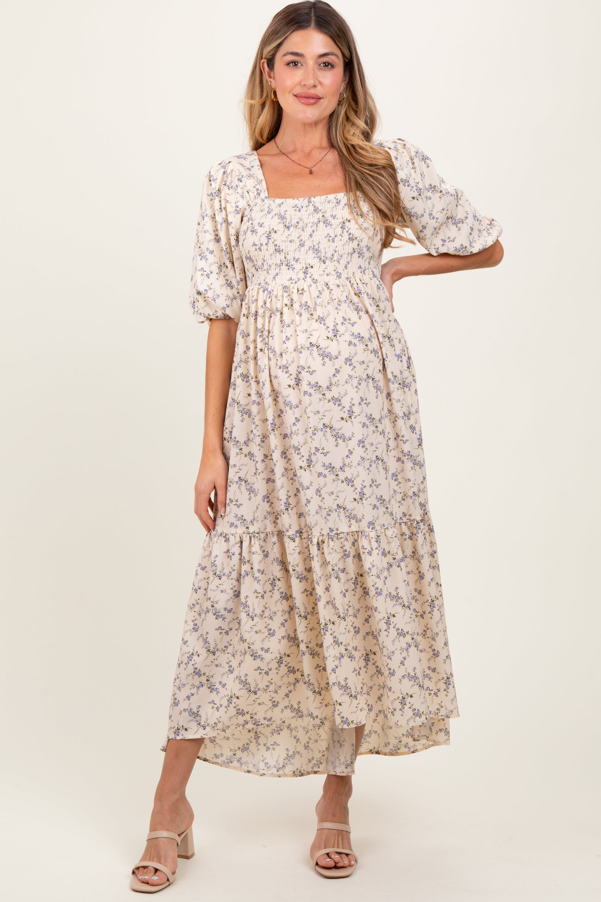 Ivory Floral Smocked Hi-Low Puff Sleeve Maternity Maxi Dress