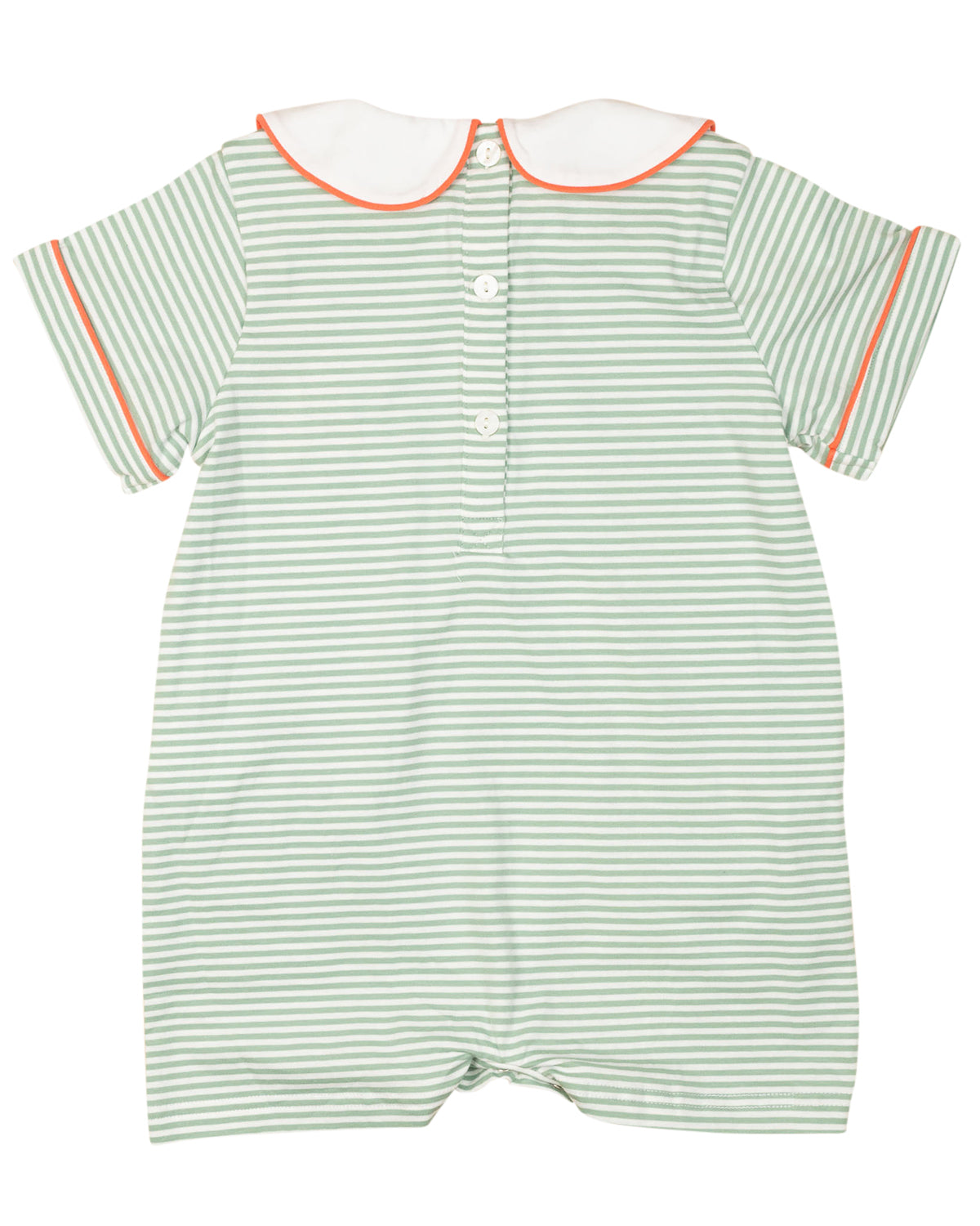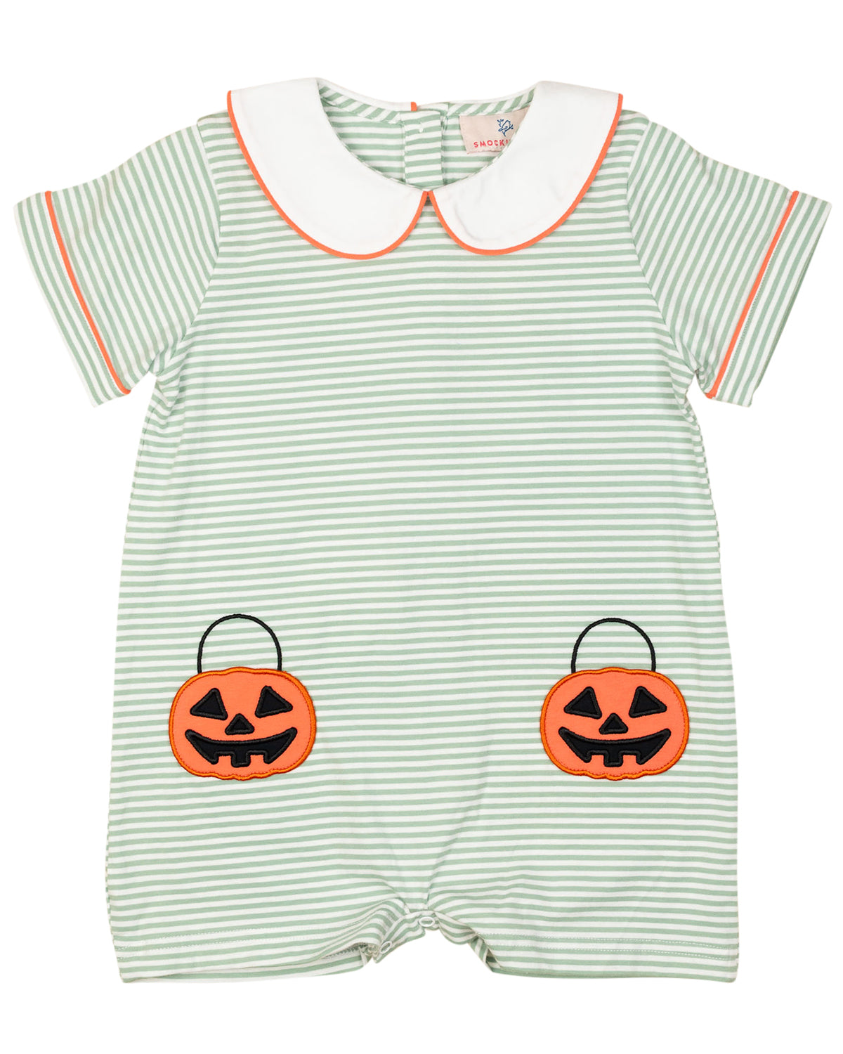 Celebrate Halloween in style with the Jack O' Lantern Applique Pocket Shortall! Featuring playful pumpkin appliqués, soft knit fabric, and an easy-to-wear design, this shortall is perfect for all of your little one’s autumn adventures. Cozy, cute, and full of festive fun!