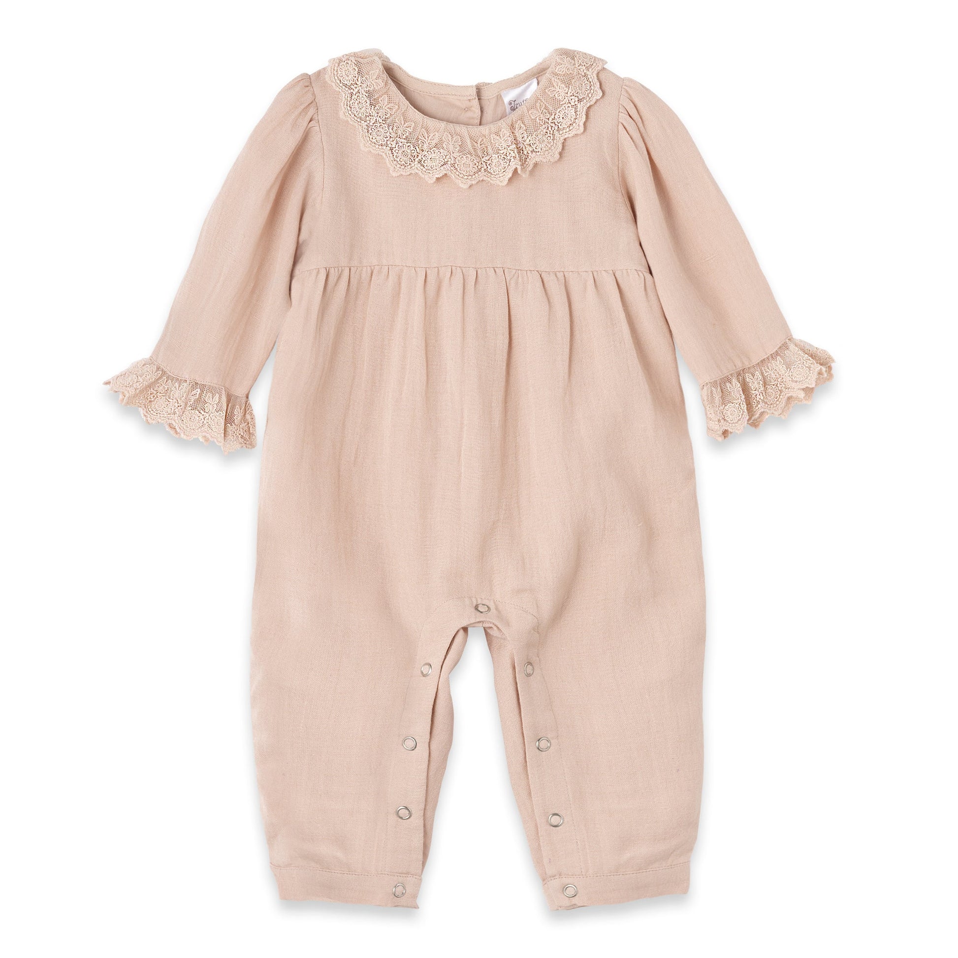 Lace Trim Baby Girl Romper in Soft Beige Rayon Linen